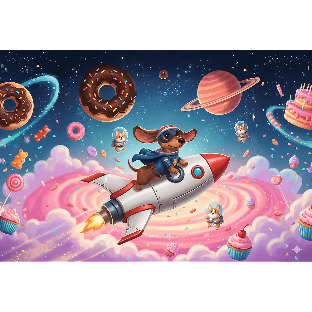 Po ułożeniu układanki powstanie obrazek o wymiarach 410x275 mm, przedstawiający pieski w kosmosie otoczone słodyczami.
