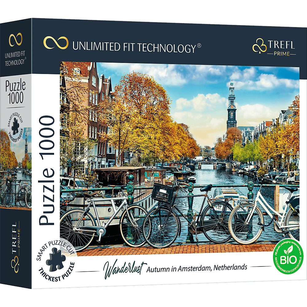 Puzzle z serii Trefl Prime UFT składające się z 1000 elementów są dedykowane prawdziwym miłośnikom układanek. Puzzle przedstawiają malowniczą jesień w Amsterdamie. Po ułożeniu powstanie obraz o wymiarach 683x480 mm.