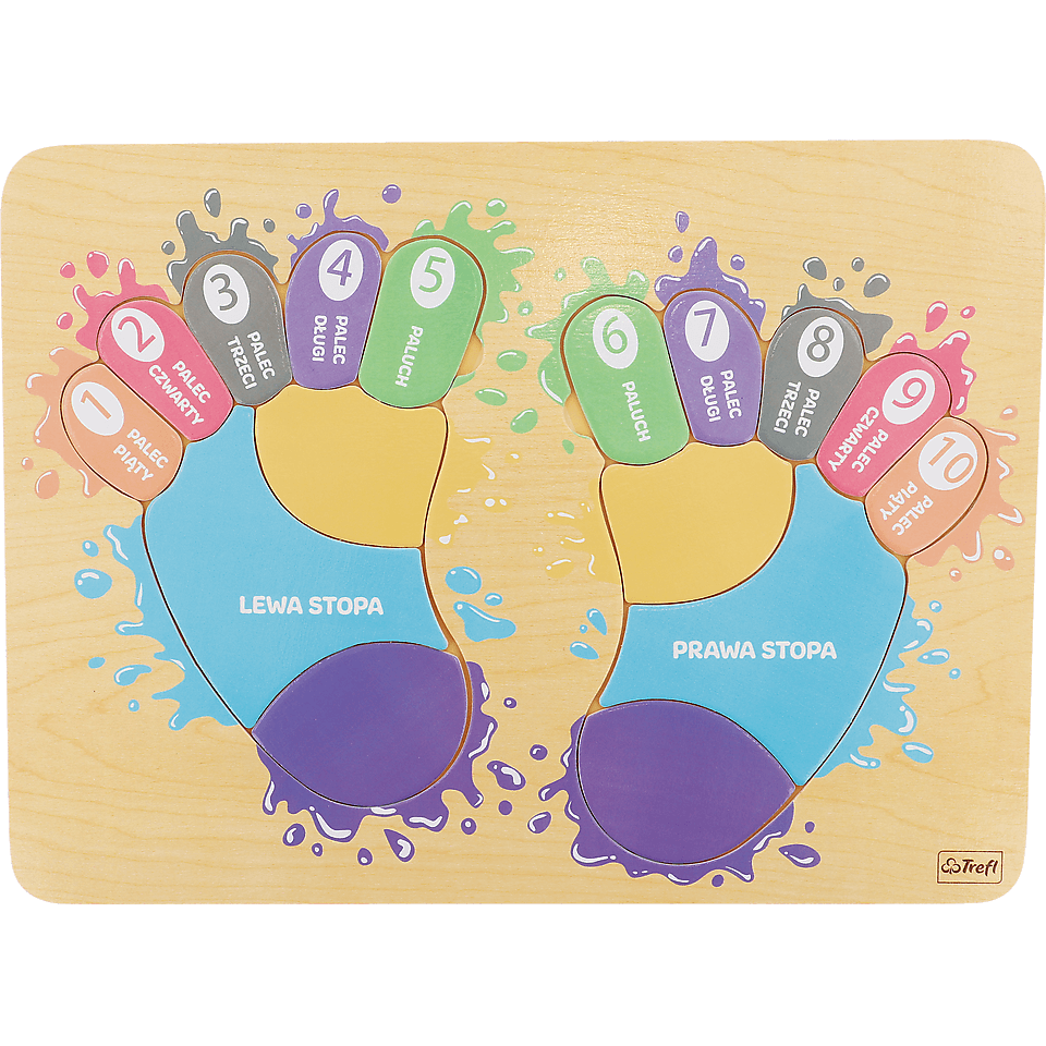 Tup Tup Stópki do 16-elementowych puzzli w kształcie stóp wykonanych z jasnego, drewna drewna.