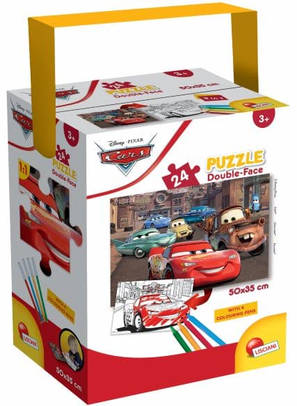 Baw się świetnie odtwarzając najlepsze sceny z bajki Auta! Układaj dwustronne puzzle, tworząc piękny obrazek lub koloruj jego czarno-biały odpowiednik, starając się odtworzyć kolory z bajki lub nadając całej scence nowego charakteru. Produkt zawiera 24 elementy dopasowane rozmiarem dla najmłodszych, które umożliwiają ułożenie obrazka o wielkości 50 x 35 cm.