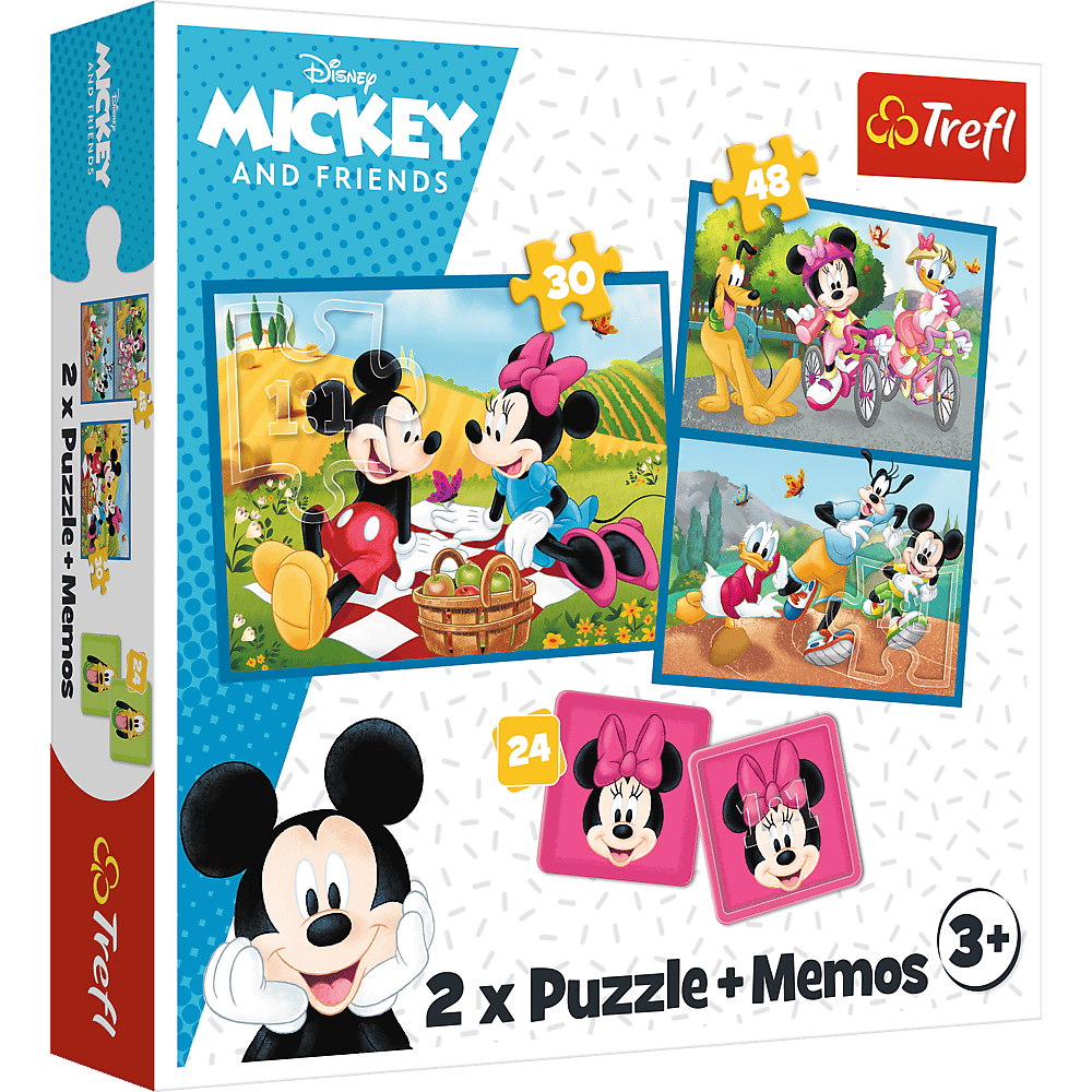 Puzzle 2w1 + memos Mickey and Friends Trefl. Puzzle 2w1 + memos składają się z 2 niezależnych układanek oraz gry memo z 24 kaflami. Puzzle są idealnie dopasowane do wieku dziecka.