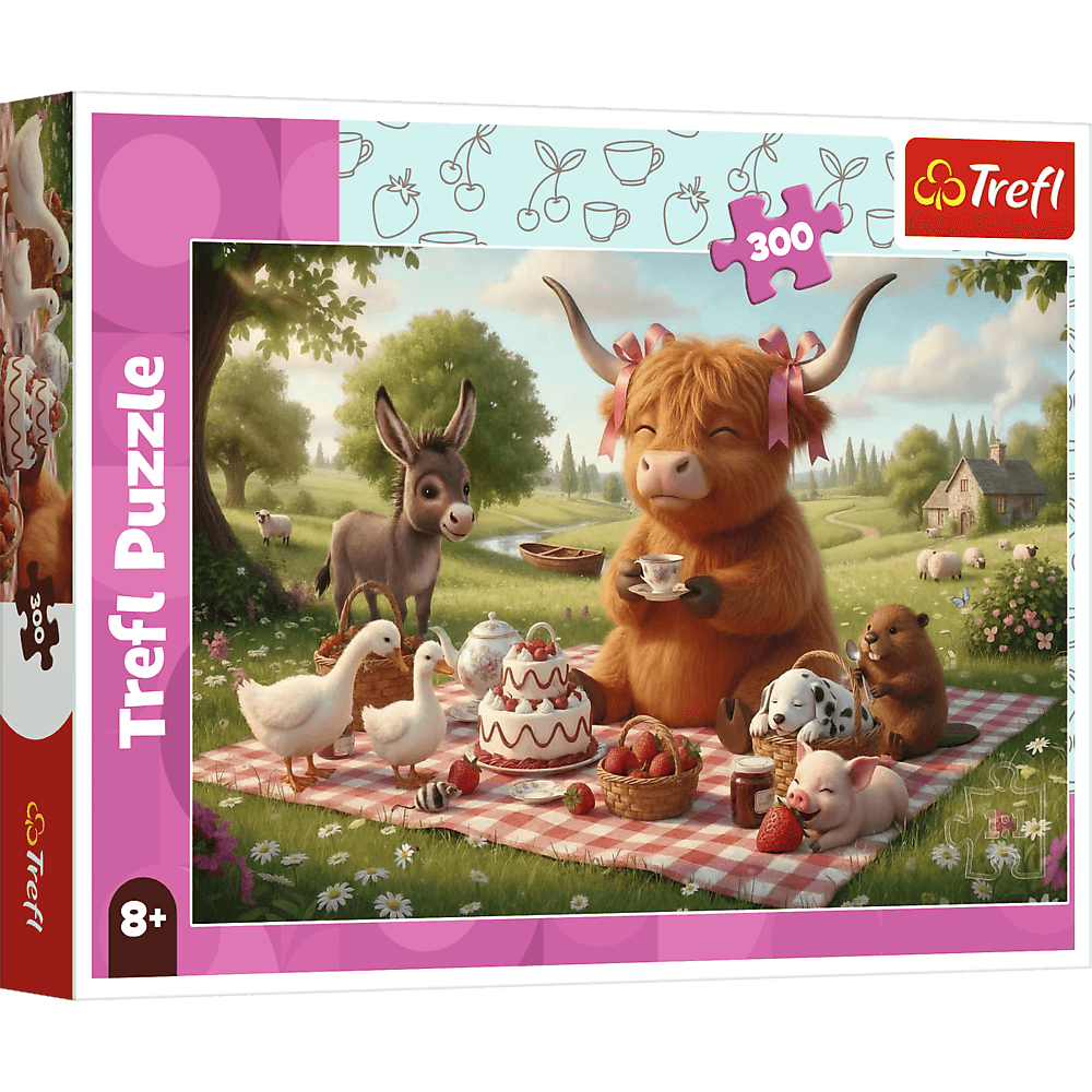Słodki piknik to puzzle składające się z 300 elementów przedstawiające urocze zwierzątka siedzące na kocu podczas sielankowego pikniku na zielonej łące. Po ułożeniu układanki powstanie obrazek o wymiarach 600x400 mm.