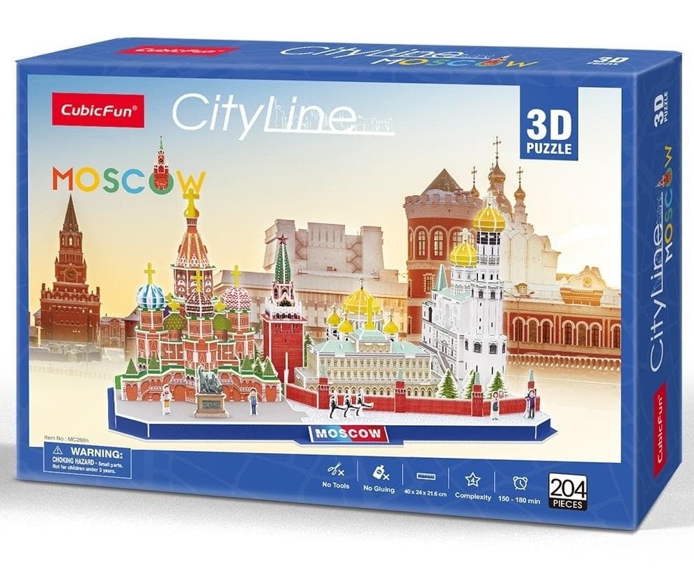 PUZZLE 3D CITYLINE MOSKWA, to pasjonująca zabawa dla dzieci i dla dorosłych. Cityline to wyjątkowa linia producenta Cubic Fun, która ukazuje panoramę danego miasta wraz z najbardziej charakterystycznymi dla niego zabytkami. W opakowaniu znajduje się 107 puzzli, wykonanych ze specjalnego materiału przypominającego piankę. Puzzle są ponumerowane, ponacinane i umieszczone na arkuszach. Wystarczy bez użycia siły wycisnąć element z arkusza i zmontować go zgodnie z dołączoną instrukcją, bez użycia kleju ani specjalnych narzędzi. Wielkość budowli po złożeniu 53,5 x 16,5 x 26 cm. Zalecany wiek dziecka 8+.