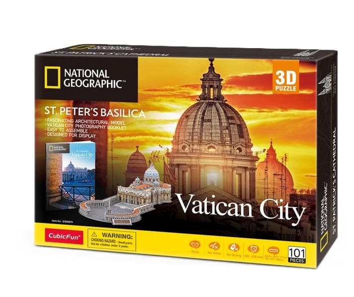 Puzzle 3D watykańskiej bazyliki Świętego Piotra. W opakowaniu znajduje się 101 puzzli, wykonanych ze specjalnego materiału przypominającego piankę. Puzzle są ponumerowane, ponacinane i umieszczone na arkuszach. Wystarczy bez użycia siły wycisnąć element z arkusza i zmontować go zgodnie z dołączoną instrukcją, bez użycia kleju ani specjalnych narzędzi. Wielkość budowli po złożeniu 54,4 x 25,9 x 17 cm. Poza puzzlami w opakowaniu znajduje się praktyczny przewodnik z ciekawostkami zawierający 36 stron.