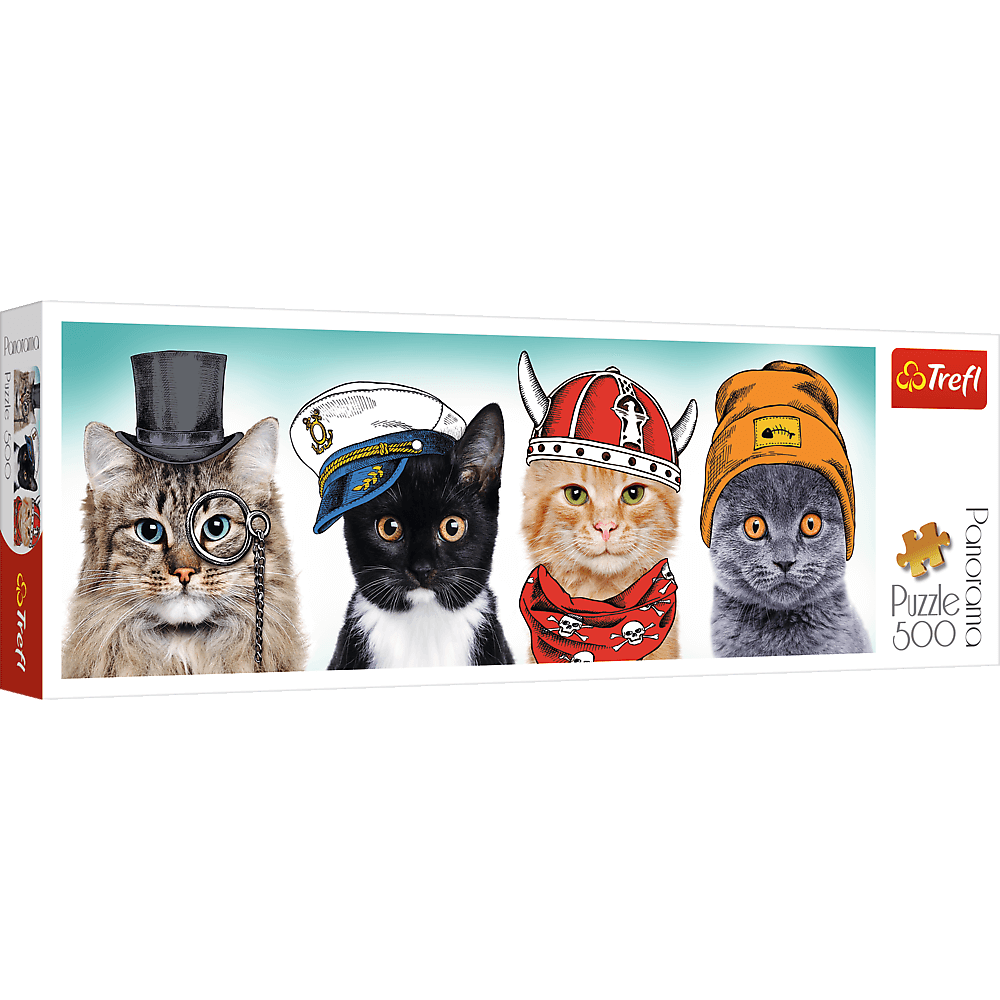 Puzzle panoramiczne składające się z 500 elementów przedstawiające zabawne koty z różnymi atrybutami