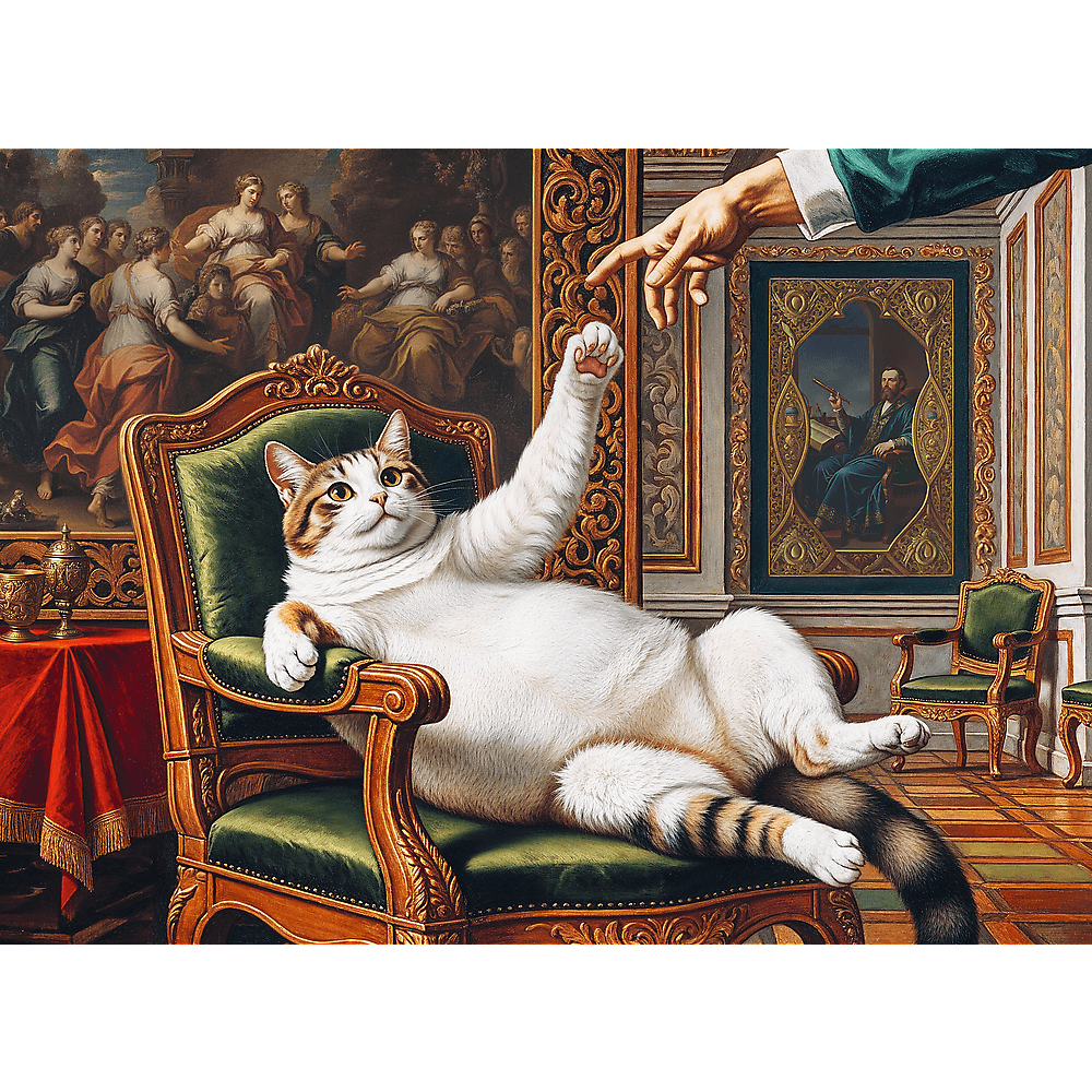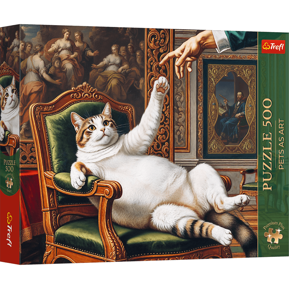 Puzzle Pets as Art: Jego Puszysta Wysokość przedstawiają dostojnie siedzącego na krześle kota z wyciągniętą łapką niczym w dziele Michała Anioła. Po ich ułożeniu powstanie obraz o wymiarach 480x340 mm.