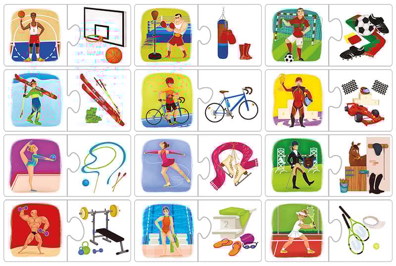 Zestaw zawiera 24 puzzle, z których można ułożyć 12 obrazków przedstawiających sportowców i atrybuty.