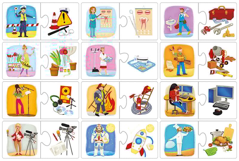 Co robi pielęgniarka? Czym posługuje się strażak w codziennych obowiązkach? Sięgnij po zawody i ich atrybuty i poznaj każdy z nich! Puzzle to idealna propozycja jako wstęp do poznania różnych karier.