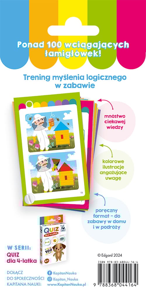 Ponad 100 wciągających łamigłówek! Quiz dla 3-latka to bogato ilustrowana książeczka, w której znajduje się ponad 100 fascynujących łamigłówek dla przedszkolaków. Pytania quizowe są podzielone na 8 kategorii tematycznych: życie codzienne dziecka, dom, przedszkole, czas wolny, miasto, wieś, spacer i wakacje. Spójrzcie na ilustracje i odpowiedzcie: które zwierzęta śpią zimą? na jakim świetle przechodzimy przez ulicę? co jemy łyżką? czego brakuje na obrazku? czyje to cienie? Wciągające zagadki trenują myślenie logiczne i poszerzają wiedzę o świecie, a kolorowe ilustracje angażują uwagę dziecka i zachęcają do koncentracji na szczegółach. Sprawdźcie, jak ciekawy jest świat, i dobrze się bawcie! Dzięki poręcznemu kieszonkowemu formatowi quiz można zabrać ze sobą wszędzie – w podróż, na piknik do parku czy do poczekalni u lekarza. Autorką pytań quizowych jest Zuzanna Osuchowska, pedagog, redaktorka książek dla dzieci, autorka publikacji edukacyjnych dla przedszkolaków i młodszych uczniów, która dba o to, by nauka była mniej formalna i bardziej przypominała zabawę. Seria QUIZ to: małe porcje wiedzy dostosowane do możliwości i zainteresowań przedszkolaków kolorowe ilustracje ułatwiające znalezienie odpowiedzi na pytanie quizowe poręczny format – mieści się w kieszeni! atrakcyjny sposób na wspólne spędzenie czasu Kapitan Nauka to marka, która powstała dzięki rodzicom poszukującym mądrej, pełnej radości, ale i wymagającej rozrywki dla dzieci. Skupiamy się na zagadkach, grach, puzzlach i książeczkach, które uczą przez kreatywną zabawę i wspomagają rozwój dziecka. Produkty Kapitana Nauki dostosowane są do potrzeb dzieci od narodzin do 11. roku życia. Stymulują rozwój kluczowych umiejętności, takich jak koncentracja, pamięć, spostrzegawczość, myślenie logiczne, kreatywność. Są świetną alternatywą dla smartfona czy komputera, a czas spędzony przy wspólnych rozgrywkach, w gronie rodziny lub rówieśników wzmacnia więzi i umiejętności komunikacyjne.