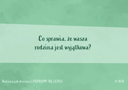 Karty konwersacyjne Rodzina jak drużyna. Poznajmy się lepiej dla dzieci w wieku 6+ pomogą Wam na nowo odkrywać siebie, szczerze rozmawiać, wspólnie się śmiać i budować w rodzinie więź, która daje siłę.