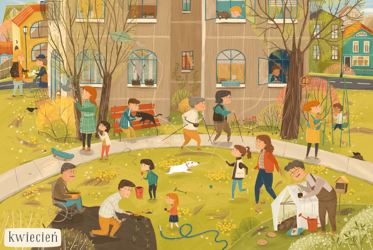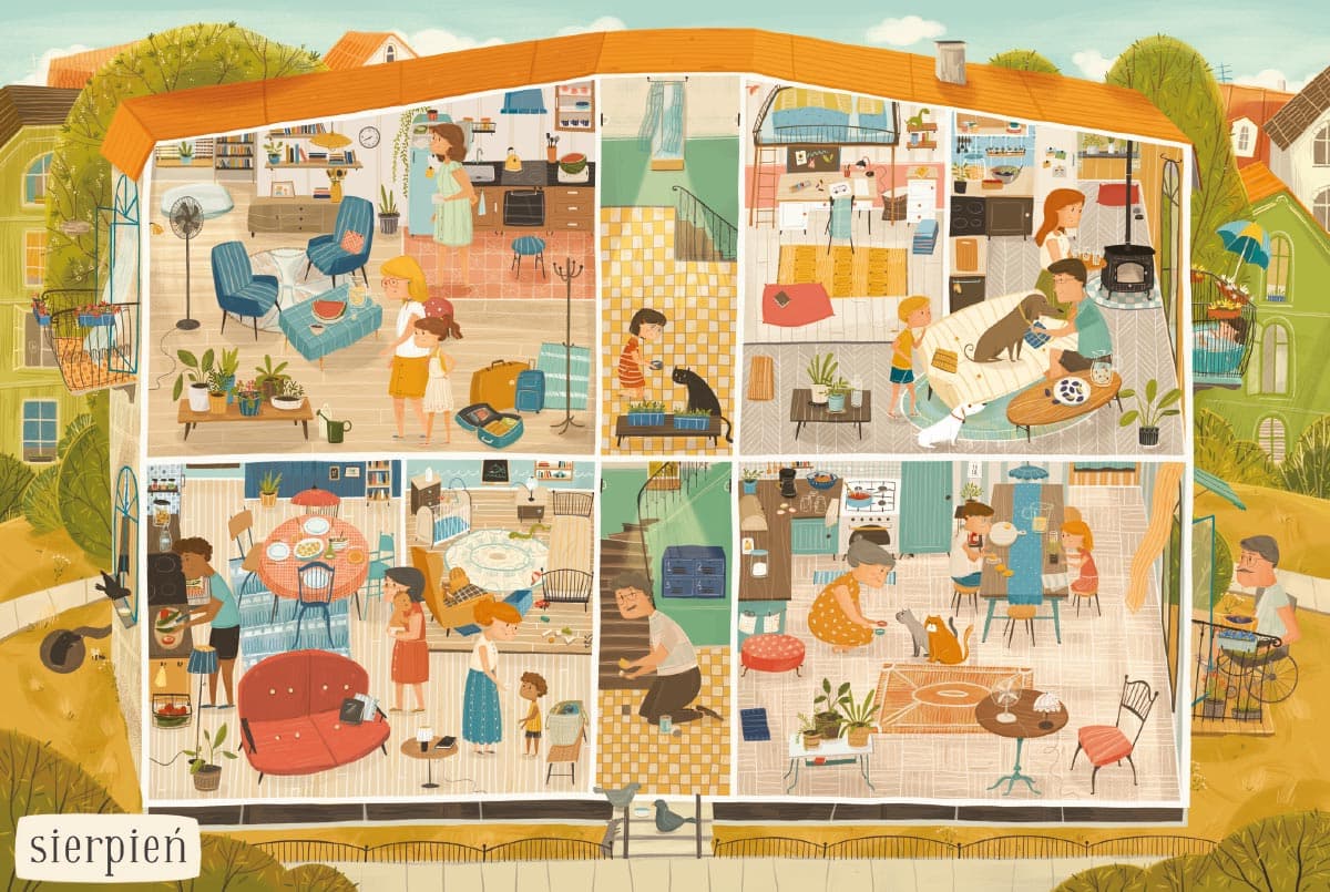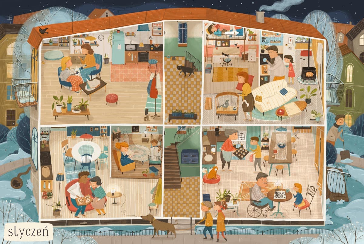 Witajcie! Na imię mi Aleks. Mieszkam przy ulicy Gołębiej 7 razem z rodzicami i braciszkiem Filipem. W naszym domu nigdy nie jest nudno! Mamy sympatycznych sąsiadów i dużo zwierzaków, a za domem jest mnóstwo miejsca na zabawę. Mamy nawet wspólny ogródek! Zapraszam was do naszej kamienicy – najfajniejszego miejsca na świecie! Kamienicę przy Gołębiej 7 zamieszkuje grupa serdecznych ludzi i ich uroczych podopiecznych: Maria i Witold z dwoma kociakami, pisarka Oliwia z rodziną, księgarka Ola z synem Antkiem i psem Azorem, prowadzący klinikę weterynaryjną Basia i Karol z córkami oraz psiakiem Kropką. Nieustannie pomaga im Krzysztof – złota rączka. Nie mogło również zabraknąć gołębi (nazwa ulicy zobowiązuje!), kosa, myszki, kreta, pająka oraz kota Benka! Tę zgraną ferajnę często odwiedzają goście: miłośnik szachów Jan, Klara – mama Oliwii, Karolina i Kacper – ukochane wnuczęta Marii i Witolda, rolnik Adam z synem Kubą, Hanna – przyjaciółka Oli, oraz jej córka Laura, a także pani listonoszka. Największe bystrzaki gdzieniegdzie wypatrzą też pszczołę Lidkę! Co oni wszyscy robią w ciągu roku? Sprawdźcie sami, oglądając pełne szczegółów ilustracje! A co wy zwykle robicie w domu i na podwórku w styczniu, lutym, marcu i innych miesiącach? Marta Kulesza z wykształcenia jest graficzką, ale jej prawdziwą pasją jest ilustracja. Nałogowo czyta książki, głównie kryminały, ale nie potrafi też przejść obojętnie obok pięknie ilustrowanych książek dla dzieci. Najlepsze pomysły wpadają jej do głowy podczas długich spacerów po lesie. Powyższy opis pochodzi od wydawcy.