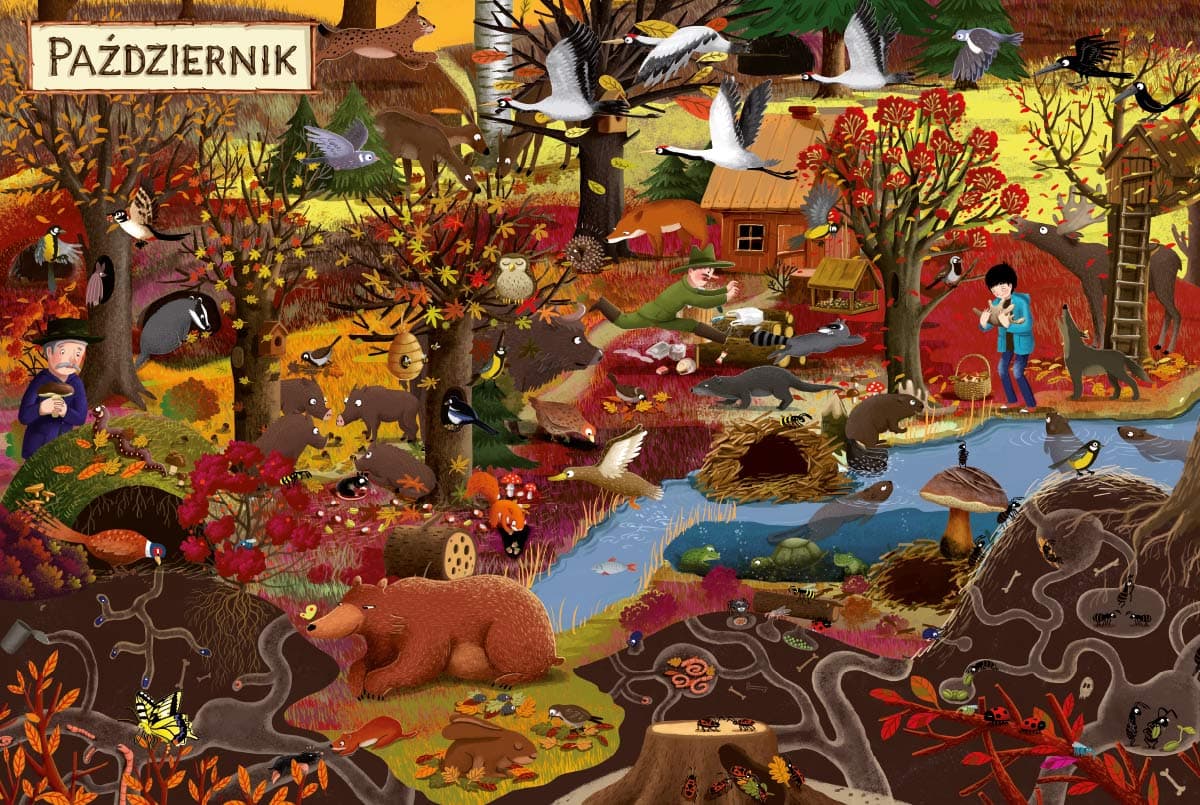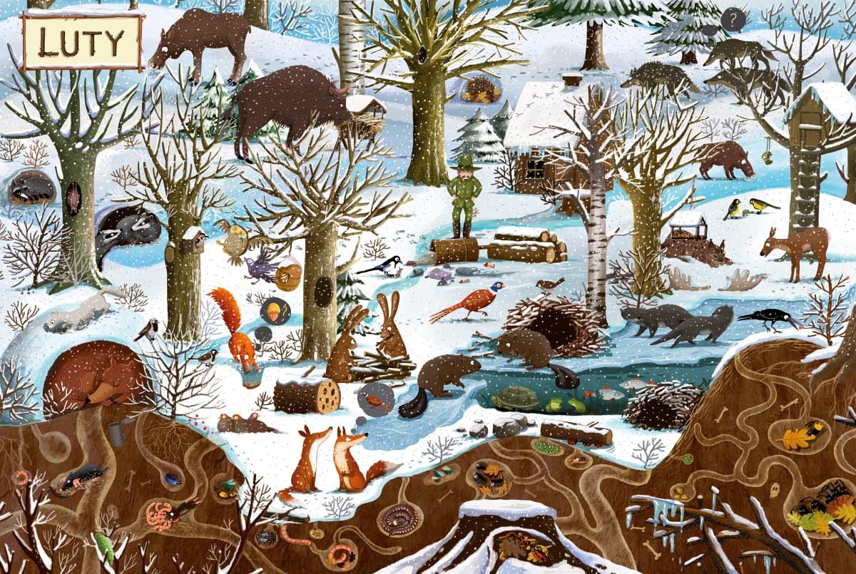 Dziki, wilki, bażanty, niedźwiadek, mrówki, dzięcioł, lisy, borsuk, zaskrońce, żaby, łoś i wiele innych zwierzaków zamieszkuje pewien las. Jak się bawią, a jak odpoczywają? Kto śpi w dzień, a kto w nocy? Kto się z kim lubi? Kto jakie ma przysmaki? Poszukajcie odpowiedzi na kartach tej niezwykłej książki. „Rok w lesie”zawiera dwanaście rozkładówek z kolejnymi miesiącami jednego roku. Każdy miesiąc to ten sam szczegółowo rozrysowany kadr lasu z mieszkańcami pokazanymi w innych sytuacjach, warunkach pogodowych, w innej porze dnia lub nocy. Dwie dodatkowe rozkładówki zawierają prezentację bohaterów i interaktywną zabawę. „Rok w lesie”można oglądać godzinami. Ta niezwykła książka pobudza wyobraźnię, rozwija spostrzegawczość, zdolność logicznego myślenia, szukania związków przyczynowo-skutkowych, umiejętność opowiadania, a przede wszystkim gwarantuje świetną zabawę. Emilia Dziubak – autorka i ilustratorka książek dla dzieci. Absolwentka Akademii Sztuk Pięknych w Poznaniu. Współpracuje z autorami i wydawnictwami w Polsce i za granicą. Laureatka Nagrody Literackiej m.st. Warszawy w 2014 r. Laureatka nagrody „Przecinek i Kropka” w konkursie na najlepszą książkę dziecięcą w 2016 r. Wyróżniona w 2016 r. w konkursie PTWK Najpiękniejsze Książki Roku 2015 za autorską książkę „Rok w lesie”. Laureatka nagrody „Żółta Ciżemka” w 2017 r. W 2018 r. wyróżniona w konkursie Książka Roku Polskiej Sekcji IBBY. Laureatka nagrody Soligatto 2019. Powyższy opis pochodzi od wydawcy.