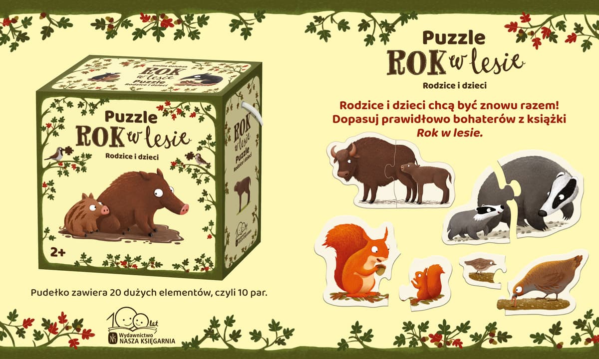 Piękne i trwałe dwuelementowe puzzle z mieszkańcami lasu. Zabawa polega na łączeniu rodziców z dziećmi. Wśród par znalazły się niedźwiadki, jeże, żubry, ryjówki czy szopy. W przypadku najmłodszych proponujemy zacząć od kilku par i stopniowo dodawać kolejne, kiedy dziecko będzie już na to gotowe. „Rok w lesie. Puzzle. Rodzice i dzieci” zachęcają do poznawania nowych zwierzątek, a także rozwijają wyobraźnię i ćwiczą dokładność i cierpliwość. Zjawiskowe grafiki Emilii Dziubak sprawiają, że to doskonały pomysł na prezent. Pudełko zawiera 20 dużych elementów, czyli 10 par do ułożenia. Wyprodukowano w Polsce. Emilia Dziubak – autorka i ilustratorka książek dla dzieci. Absolwentka Akademii Sztuk Pięknych w Poznaniu. Współpracuje z autorami i wydawnictwami w Polsce i za granicą. Laureatka Nagrody Literackiej m.st. Warszawy w 2014 r. Laureatka nagrody „Przecinek i Kropka” w konkursie na najlepszą książkę dziecięcą w 2016 r. Wyróżniona w 2016 r. w konkursie PTWK Najpiękniejsze Książki Roku 2015 za autorską książkę „Rok w lesie”. Laureatka nagrody „Żółta Ciżemka” w 2017 r. W 2018 r. wyróżniona w konkursie Książka Roku Polskiej Sekcji IBBY. Laureatka nagrody Soligatto 2019. Powyższy opis pochodzi od wydawcy.