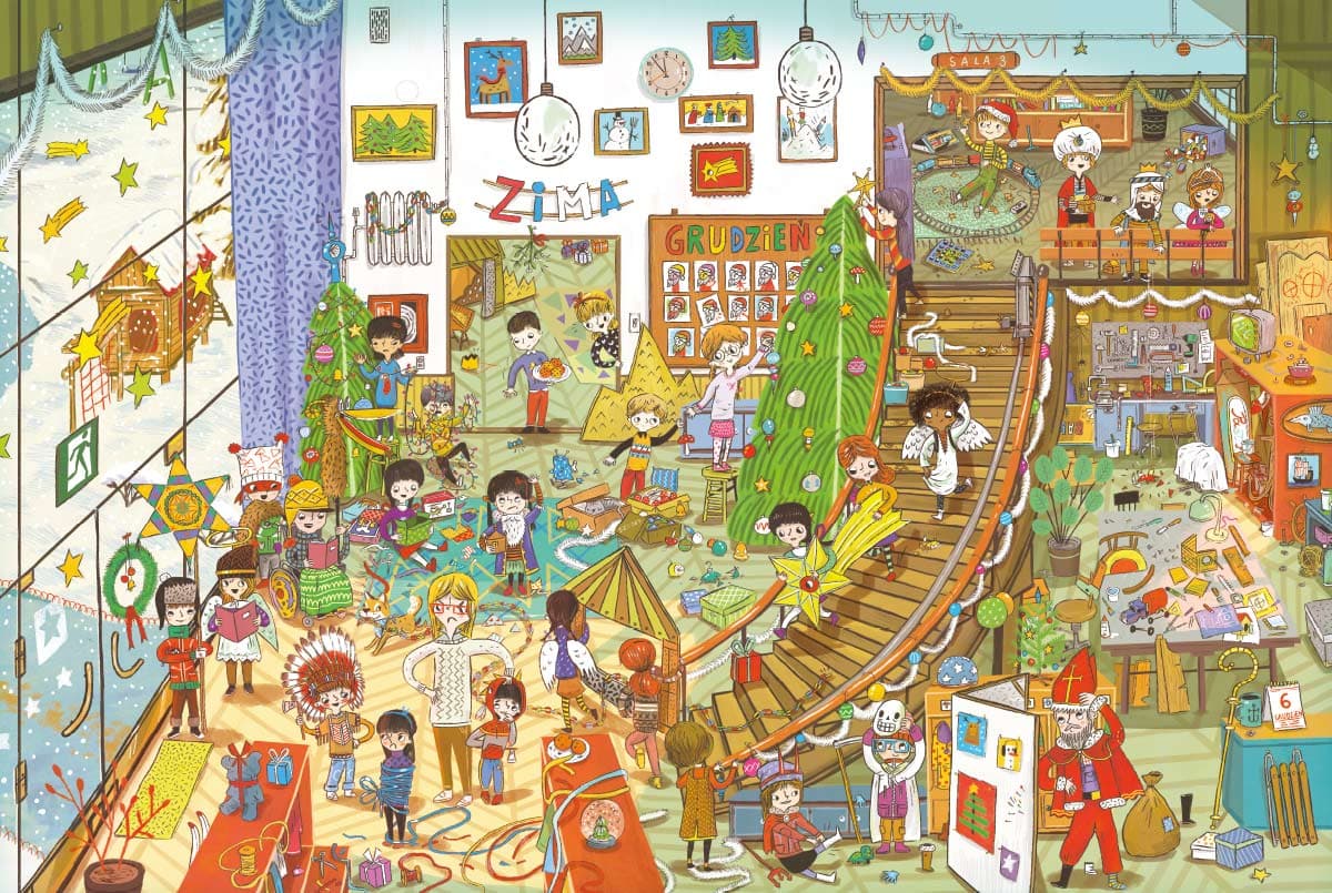 Witajcie w naszym przedszkolu! Tu się uczymy i bawimy. Ignaś lubi grać w piłkę, Maks jest specjalistą od dinozaurów, z Krzysiem, moim ulubionym kolegą, wciąż robimy jakieś kawały. Zosia z kolei wiecznie coś gubi, a Wiktoria wydaje przyjęcia dla lalek… Nawet mały Aleks zostawia czasem swoją poduszkę bezpieczeństwa i do nas dołącza. Poza panią Anią, wychowawczynią, są jeszcze pan Marcel i jego pies Bazyl. Dbamy też o kotkę Felkę – psotnica ciągle się chowa, a my jej szukamy. Chodźcie, musicie wszystkich poznać! „Rok w przedszkolu” zawiera dwanaście rozkładówek wprowadzających dziecko w życie przedszkolne. Miesiąc po miesiącu towarzyszymy bohaterom w czasie najważniejszych świąt i uroczystości. Obserwujemy codzienne zabawy i naukę. Dwie rozkładówki są poświęcone prezentacji bohaterów oraz interaktywnej zabawie. Dzięki szczegółowym obrazkom dziecko ćwiczy spostrzegawczość, umiejętność opowiadania, ale przede wszystkim doskonale się bawi, odkrywając szczegóły kolorowych ilustracji. Przemysław Liput – ur. w 1985 r. w Sanoku. W 2010 roku ukończył studia na kierunku Grafika na Wydziale Sztuki Uniwersytetu Pedagogicznego w Krakowie. Dyplom magisterski w pracowni druku cyfrowego pt. „Niedobici”. Jest autorem ilustracji do książek. Od 2011 prowadzi zajęcia z filmu animowanego na Wydziale Sztuki Uniwersytetu Pedagogicznego w Krakowie. Realizuje prace w technikach graficznych, rysunkowych oraz wideo. W filmie animowanym interesuje się działaniami bezkamerowymi i przedkinematograficznymi.