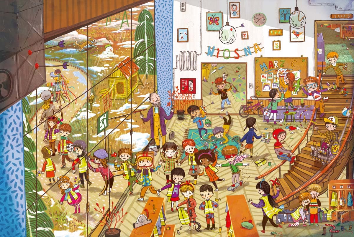 Tu się uczymy i bawimy. Ignaś lubi grać w piłkę, Maks jest specjalistą od dinozaurów, z Krzysiem, moim ulubionym kolegą, wciąż robimy jakieś kawały. Zosia z kolei wiecznie coś gubi, a Wiktoria wydaje przyjęcia dla lalek… Nawet mały Aleks zostawia czasem swoją poduszkę bezpieczeństwa i do nas dołącza. Poza panią Anią, wychowawczynią, są jeszcze pan Marcel i jego pies Bazyl. Dbamy też o kotkę Felkę – psotnica ciągle się chowa, a my jej szukamy. Chodźcie, musicie wszystkich poznać! "Rok w przedszkolu" zawiera dwanaście rozkładówek wprowadzających dziecko w życie przedszkolne. Miesiąc po miesiącu towarzyszymy bohaterom w czasie najważniejszych świąt i uroczystości. Obserwujemy codzienne zabawy i naukę. Dwie rozkładówki są poświęcone prezentacji bohaterów oraz interaktywnej zabawie. Dzięki szczegółowym obrazkom dziecko ćwiczy spostrzegawczość, umiejętność opowiadania, ale przede wszystkim doskonale się bawi, odkrywając szczegóły kolorowych ilustracji.