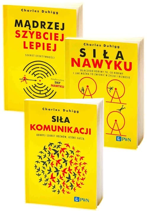 "Siła komunikacji" Charles Duhigg zagłębił się w to, jak się komunikujemy i co takiego robią najlepsi przyjaciele, wytrawni negocjatorzy i doświadczeni menadżerowie, że ludzie decydują się im zaufać. Wyróżnił trzy rodzaje rozmów, które najczęściej toczymy, i pokazał, jak je prowadzić, by miały sens: O co tak naprawdę chodzi? – w konfliktach, negocjacjach i codziennych domowych sprawach ważne jest ustalenie, na czym zależy rozmówcom. Zajrzymy do pokoju, w którym ława przysięgłych decydowała o losie Leeroya Reeda, by zrozumieć, że to nie siła argumentów, ale ustalenie wspólnego celu jest kluczem do porozumienia. Jak się czujemy? – zazwyczaj unikamy rozmowy o emocjach. Na podstawie historii Felixa Sigali, genialnego agenta FBI i mistrza przesłuchań, przekonamy się, że to możliwość przekazania swojej opowieści i wysłuchania historii drugiej osoby zbliża jak nic innego. Kim jesteśmy? – największym hamulcem sensownych rozmów jest szufladkowanie rozmówcy do kategorii, w której nie chciałby się on znaleźć, jednowymiarowe traktowanie. Zajrzymy do siedziby Netlfixa – mimo że wspierano w niej otwartą, a nawet agresywną komunikację, jeden z dyrektorów powiedział na spotkaniu literalnie o jedno słowo za dużo… "Siła nawyku" Charles Duhigg udowadnia, że odpowiednie pokierowanie wyrobieniem nowych lub zmianą dotychczasowych nawyków może diametralnie odmienić czyjeś życie , ale także funkcjonowanie społeczeństw, przedsiębiorstw, grup zawodowych, państw... Autor na sprawdzonych przykładach dowodzi, że świadomość, zrozumienie i zmiana nawyków pomagają osiągać wymarzone cele. Jak jeden człowiek od reklamy namówił Amerykanów do codziennego mycia zębów i dlaczego pasta Pepsodent stała się najpopularniejszą pastą do zębów na świecie? Jak Lisa, przez wiele lat uzależniona od papierosów i alkoholu, otyła, zadłużona i niezdolna do utrzymania stałej pracy, zmieniła się w wolną od nałogów, zgrabną kobietę sukcesu? Co sprawia, że Starbucks odnosi światowy sukces? W jaki sposób Procter & Gamble przekonał klientów, że świeże powietrze wymaga odświeżaczy powietrza? Dlaczego pływak, Michael Phelps, wygrał wyścig płynąć na oślep? "Mądrzej, szybciej, lepiej. Sekret efektywności" "Mądrzej, szybciej, lepiej", to książka nie tylko dla tych, którzy bezradnie stwierdzają, iż nie panują nad swoim życiem. To takżeporadnikdla ludzisukcesu, którzy chcieliby zrealizować nieosiągalny dotąd cel! Młoda kobieta rzuca studia doktoranckie i zaczyna grać w pokera. Wdrożywszy się w system analizowania możliwych scenariuszy i wyliczania szans na ich ziszczenie, potrafi określić z góry błędy swoich przeciwników i staje się jedną z najlepszych zawodniczek na świecie. Grupa specjalistówGoogle przez cztery lata gromadzi dane na temat funkcjonowania najlepszych zespołów pracowniczych, aby ogłosić, że ważniejsze jest to, co łączy grupę, niż jej personalny skład. Generał piechoty morskiej Stanów Zjednoczonych, widząc niskie morale ochotników, układa od nowa program szkolenia w obozie dla rekrutów. Okazuje się, że wypracowanie postawy „ukierunkowanej na działanie” może zmienić nawet najbardziej rozchwianych nastolatków w niepokonanych zdobywców. Termin premiery Krainy lodu wytwórni Walt Disney Pictureszbliża się wielkimi krokami. Katastrofa wisi w powietrzu, jednak zespół produkcyjny otrząsa się z niemocy, przeżywa twórczy przełom i w efekcie powstaje jeden z najlepszych filmów animowanych w historii kina.