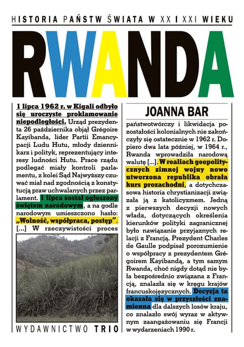Pierwszy na polskim rynku wydawniczym zarys XX-wiecznej historii Rwandy, której wyraźnie wyodrębnionymi etapami był okres kolonialny, lata I i II Republiki, wojna domowa lat 1990-1994 oraz powojenne lata odbudowy państwa, prowadzonej przez ekipę obecnego prezydenta, Paula Kagame. Prezentowana monografia jest zarazem próbą naukowej analizy XX-wiecznych przemian Rwandy, w pierwszym zaś rzędzie przebiegu procesów społeczno-politycznych, które doprowadziły u progu lat 60. do zaburzenia stabilnej dotąd konstrukcji państwowej i nieodwracalnych zmian w strukturze społeczeństwa. Najbardziej tragicznych ich skutkiem była trzydziestoletnia wojna domowa, której momentem kulminacyjnym był rok 1994 i próba całkowitej eksterminacji Tutsi.