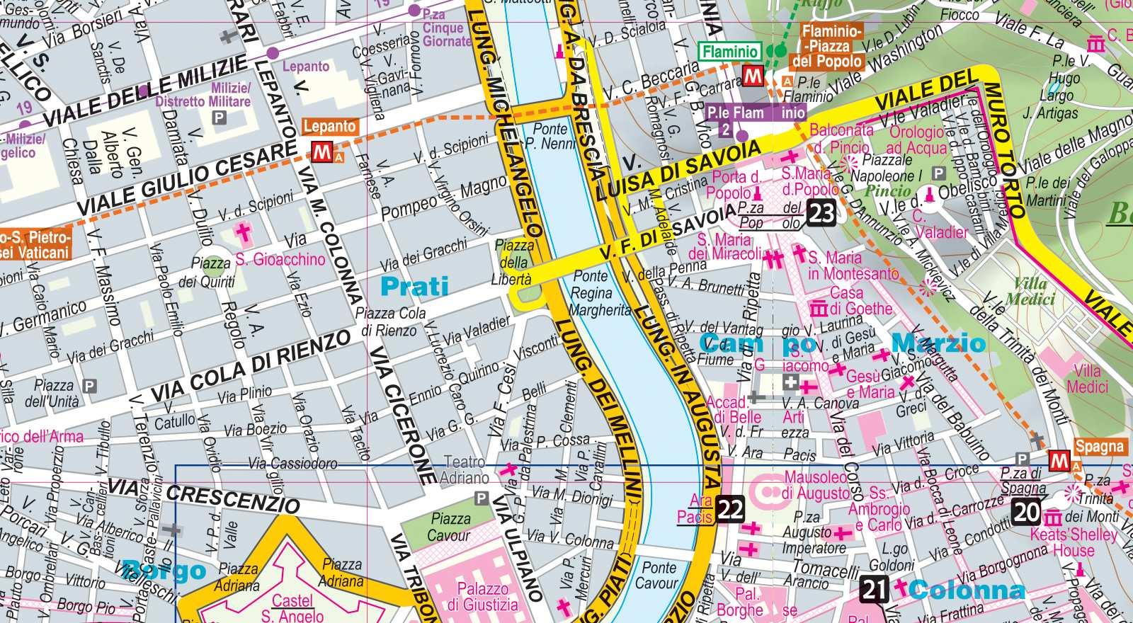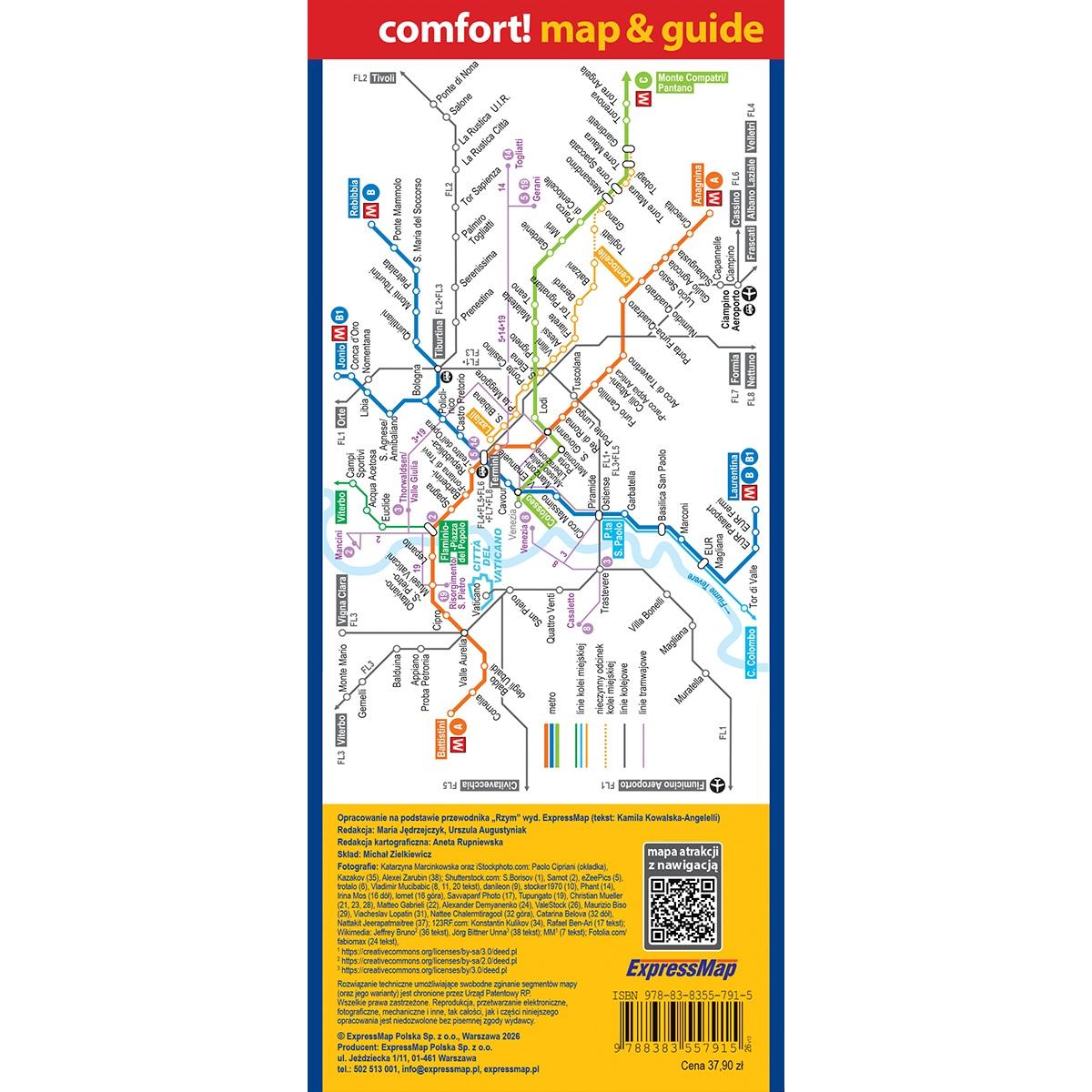 • mapa w skalach użytecznych dla turystów (plan miasta 1:15 000, plan centrum 1:10 000, plan dzielnicy EUR),
