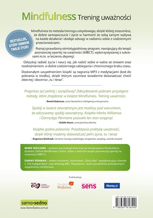 Jak znaleźć spokój w pędzącym świecie (książka + MP3 z medytacjami) Mindfulness to metoda treningu umysłowego, dzięki której zrozumiesz, że dobre samopoczucie i życie w harmonii ze sobą samym wpływa na każde działanie i dodaje odwagi w radzeniu sobie z codziennymi przeciwnościami. Bestseller, który odmieni Twoje życie! Poznaj sprawdzony ośmiotygodniowy program, nawiązujący do terapii poznawczej opartej na uważności (MBCT), wykorzystywanej z sukcesami m.in. w leczeniu depresji. Odzyskaj radość życia i naucz się, jak radzić sobie w walce ze stresem oraz rozdrażnieniem, w dobie codziennego zabiegania i chronicznego braku czasu. Doskonałym uzupełnieniem książki są nagrania MP3 z medytacjami (kod do pobrania w książce), dzięki którym zaczniesz świadomie doświadczać chwili obecnej i docenisz „tu i teraz”. O książce: Pragniesz żyć pełniej i szczęśliwiej? Zdecydowanie polecam przystępne metody, które znajdziesz w książce Mindfulness. Trening uważności. – Daniel Goleman, autor bestsellera Inteligencja emocjonalna Spokój w świecie zewnętrznym jest możliwy pod warunkiem, że odczuwamy spokój wewnętrzny. Książka Marka Williamsa i Danny’ego Penmana pozwala ten stan osiągnąć. – Goldie Hawn, amerykańska aktorka Książka godna polecenia. Przedstawia praktykę uważności, dzięki której możemy doświadczać pełni życia tu i teraz. – Dagmara Gmitrzak, trenerka rozwoju osobistego, terapeutka, socjolog, autorka książek O autorach: MARK WILLIAMS – profesor psychologii klinicznej na Uniwersytecie Oksfordzkim, dyrektor Oxford Mindfulness Centre. Jeden z twórców terapii poznawczej opartej na uważności (MBCT). DANNY PENMAN – doktor biochemii, dziennikarz „Daily Mail”, współpracujący również z „The Independent” oraz telewizją BBC. Współautor i autor poradników poświęconych zagadnieniu mindfulness, m.in. Mindfulness dla zdrowia wydanej w serii Samo Sedno.