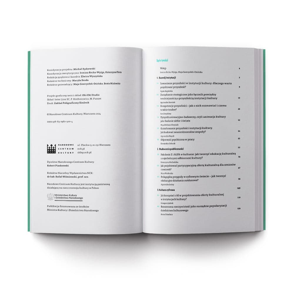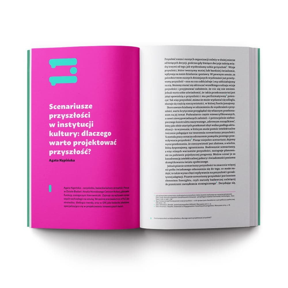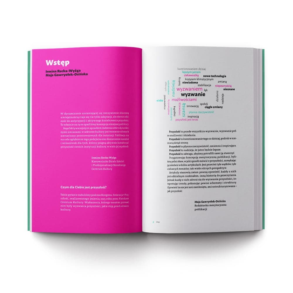 W dynamicznie zmieniającej się rzeczywistości kluczową umiejętnością staje się nie tylko adaptacja, ale również zdolność do antycypacji i aktywnego kształtowania przyszłości. To właśnie na tym oparliśmy koncepcję niniejszej publikacji. Najefektywniejszym sposobem radzenia sobie z dynamicznymi zmianami w sektorze kultury jest tworzenie własnych scenariuszy prorozwojowych dla instytucji. Publikacja ma na celu zgłębienie tego podejścia oraz dostarczenie narzędzi i wskazówek dla tych, którzy pragną aktywnie kształtować przyszłość swoich instytucji kultury, w wielu jej aspektach. Przygotowując koncepcję merytoryczną publikacji, byliśmy pełni obaw, w jaki sposób mówić o przyszłości, zamykając ją zaledwie w kilku artykułach. Jest przecież tyle wątków, tyle ciekawych tematów, tak wiele różnych perspektyw. Artykuły stanowią zatem pewną opowieść, każdy z nich jest oddzielnym rozdziałem, inną historią do przeczytania. Jednak każdy z nich odnosi się do wyzwania przyszłości, intepretując trendy, pokazując pewne schematy i struktury. Opowieść ta nie jest ani zamknięta, ani ustrukturyzowana – jak przyszłość.
