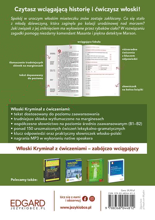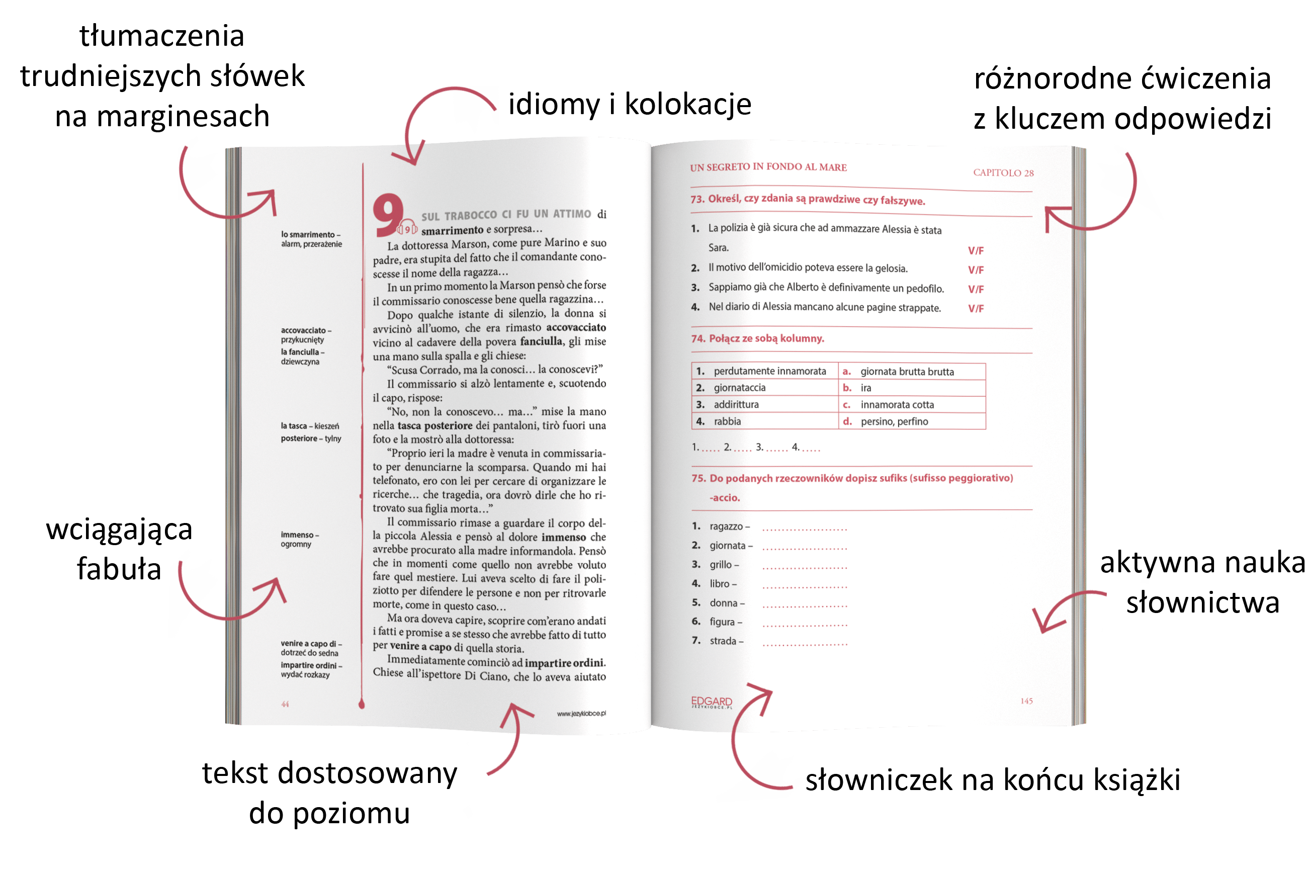 Jeśli znasz włoski na poziomie B1, z łatwością wciągniesz się w mrożącą krew w żyłach opowieść, dzięki której poznasz nowe słownictwo oraz przećwiczysz konstrukcje gramatyczne. Nawet nie zauważysz, w jak lekki i naturalny sposób pogłębisz znajomość słownictwa, by używać go swobodnie także w codziennych sytuacjach.