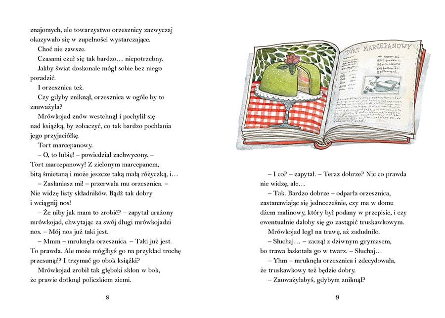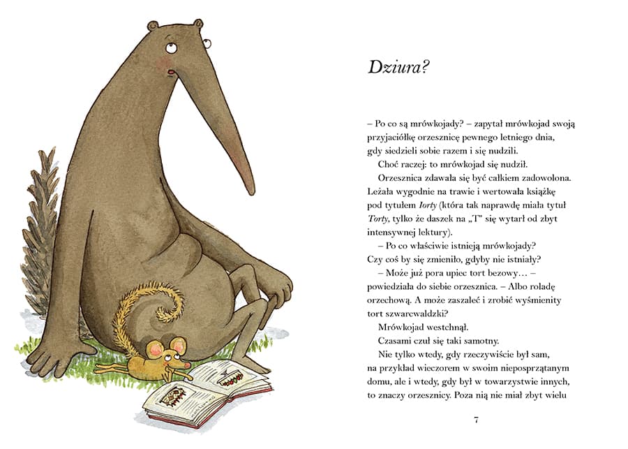 Już niedługo mrówkojad przestanie być marnym paprochem w kosmosie. Napisze książkę o sensie życia. Tylko co tak naprawdę jest sensem życia? Zdaje się, że każdy ma na ten temat swoje zdanie. – Czy coś by się zmieniło, gdyby nie było mrówkojadów? – zapytał. – Czy to dałoby się jakoś odczuć? Na świecie? – Zapewne tak – odparła orzesznica. – Czyli co? Powstałoby coś w rodzaju dziury? – zastanawiał się mrówkojad. Orzesznica przytaknęła. – Dziury po mrówkojadach? Orzesznica znów przytaknęła. – Bo wiesz, zastanawiałem się nad tym – tłumaczył mrówkojad – że nawet gdyby powstała ogromna dziura po mrówkojadach, to świat jest przecież taki wielki, że pewnie ledwo dałoby się to zauważyć. Dowcipna i mądra opowieść o tym, jak różnić się mogą nasze sensy życia. Do czytania samodzielnie lub całą rodziną. Polecamy również dwie inne opowieści o mrówkojadzie i orzesznicy: „Dziwne zwierzęta" oraz „Inna podróż".