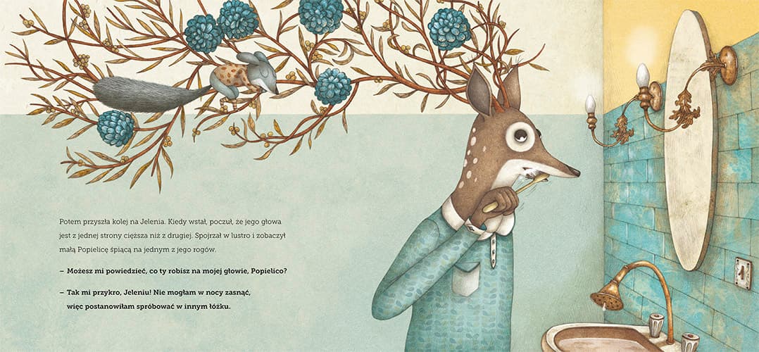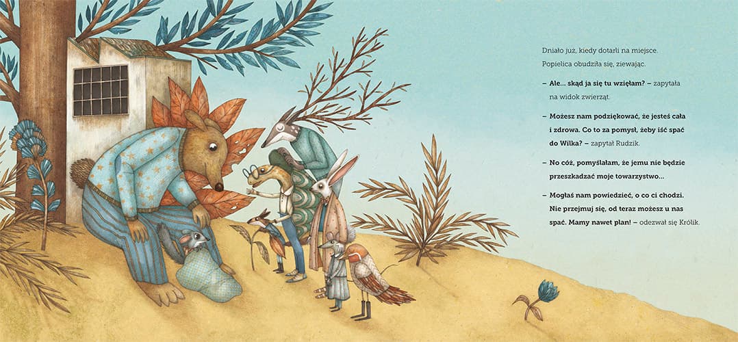 Malutka Popielica każdej nocy zakrada się do domu któregoś z przyjaciół i wypróbowuje różne łóżka: pojemnik na marchew Królika, szufladę z krawatami Rudzika, poroże Jelenia, but Niedźwiedzia, etui na okulary Żółwia, zegar z kukułką Myszy, pozytywkę Wiewiórki. Pewnego dnia zmęczone jej zachowaniem zwierzęta postanawiają z nią porozmawiać. Proszą, żeby nie robiła zamieszania i trzymała się własnego legowiska. Nie wiedzą, że tak naprawdę malutka Popielica boi się spać sama i zrobi wszystko, żeby tylko mieć w nocy towarzystwo – zdesperowana nie zawaha się nawet przenocować w skarpecie złego Wilka. Co zrobią przyjaciele Popielicy, gdy się o tym dowiedzą? Czy mała wiercipięta już zawsze będzie sypiać poza domem? Ciepła i przejmująca opowieść o potrzebie bezpieczeństwa i otaczania opieką słabszych. Idealna dla małych czytelników i czytelniczek, którzy nie chcą zrezygnować ze spania w nie swoich łóżkach. Książka autorów innych uwielbianych przez dorosłych i dzieci tytułów kolekcji OQO – Nie trzeba słów, Najlepsza zupa na świecie, Niedźwiedź – łowca motyli.