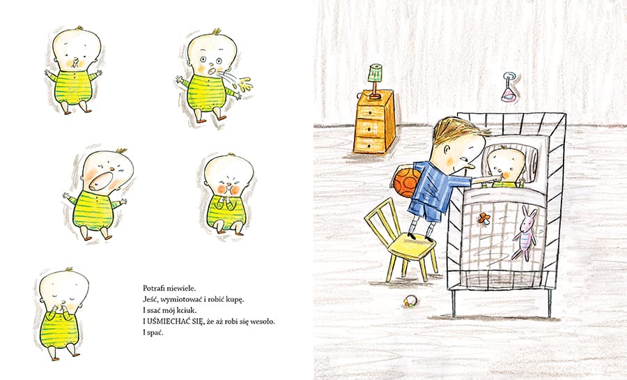 Najpierw jej nie było. Potem była piłką w brzuchu mamy. Teraz jest moją siostrzyczką. Prosta, ciepła historia o tym, jak to jest, kiedy na świecie pojawia się młodsze rodzeństwo. Początkowo nie można się z nim ani porozumieć, ani za bardzo pobawić, ale można – poczuć się dużym i odpowiedzialnym! Ulf Stark to jeden z najwybitniejszych szwedzkich autorów książek dla dzieci i młodzieży. W Polsce ukazało się kilkanaście tytułów jego autorstwa, z czego największą popularością cieszą się „Jak tata pokazał mi wszechświat”, „Jak mama została Indianką” oraz wierszyki o Cynamonie i Trusi. Charlotte Ramel zilustrowała m.in. wiersze Ulfa Starka o Cynamonie i Trusi, książkę Barbro Lindgren „Teraz będziesz kurą”, a także serię Lotty Olsson dla najmłodszych Co Wokoło.