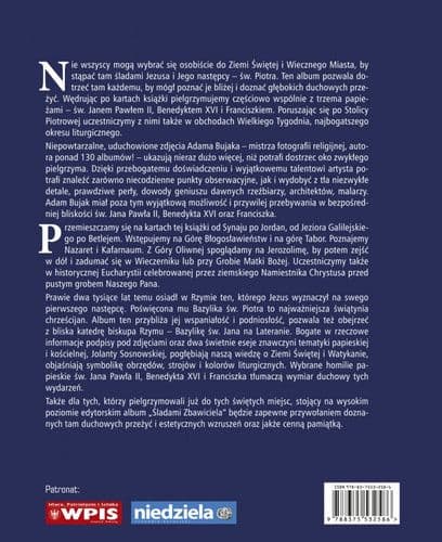 Nie wszyscy mogą wybrać się osobiście do Ziemi Świętej i Wiecznego Miasta, by stąpać tam śladami Jezusa i Jego następcy – św. Piotra. Ten album pozwala dotrzeć tam każdemu, by mógł poznać je bliżej i doznać głębokich duchowych przeżyć. Wędrując po kartach książki pielgrzymujemy częściowo wspólnie z trzema papieżami – św. Janem Pawłem II, Benedyktem XVI i Franciszkiem. Poruszając się po Stolicy Piotrowej uczestniczymy z nimi także w obchodach Wielkiego Tygodnia, najbogatszego okresu liturgicznego. Niepowtarzalne, uduchowione zdjęcia Adama Bujaka – mistrza fotografii religijnej, autora ponad 130 albumów! – ukazują nieraz dużo więcej, niż potrafi dostrzec oko zwykłego pielgrzyma. Dzięki przebogatemu doświadczeniu i wyjątkowemu talentowi artysta potrafi znaleźć zarówno niecodzienne punkty obserwacyjne, jak i wydobyć z tła niezwykłe detale, prawdziwe perły, dowody geniuszu dawnych rzeźbiarzy, architektów, malarzy. Adam Bujak miał poza tym wyjątkową możliwość i przywilej przebywania w bezpośredniej bliskości św. Jana Pawła II, Benedykta XVI oraz Franciszka. Przemieszczamy się na kartach tej książki od Synaju po Jordan, od Jeziora Galilejskiego po Betlejem. Wstępujemy na Górę Błogosławieństw i na górę Tabor. Poznajemy Nazaret i Kafarnaum. Z Góry Oliwnej spoglądamy na Jerozolimę, by potem zejść w dół i zadumać się w Wieczerniku lub przy Grobie Matki Bożej. Uczestniczymy także w historycznej Eucharystii celebrowanej przez ziemskiego Namiestnika Chrystusa przed pustym grobem Naszego Pana. Prawie dwa tysiące lat temu osiadł w Rzymie ten, którego Jezus wyznaczył na swego pierwszego następcę. Poświęcona mu Bazylika św. Piotra to najważniejsza świątynia chrześcijan. Album ten przybliża jej wspaniałość i podniosłość, pozwala też obejrzeć z bliska katedrę biskupa Rzymu – Bazylikę św. Jana na Lateranie. Bogate w rzeczowe informacje podpisy pod zdjęciami oraz dwa świetnie eseje znawczyni tematyki papieskiej i kościelnej, Jolanty Sosnowskiej, pogłębiają naszą wiedzę o Ziemi Świętej i Watykanie, objaśniają symbolikę obrzędów, strojów i kolorów liturgicznych. Wybrane homilie papieskie św. Jana Pawła II, Benedykta XVI i Franciszka tłumaczą wymiar duchowy tych wydarzeń. Także dla tych, którzy pielgrzymowali już do tych świętych miejsc, stojący na wysokim poziomie edytorskim album „Śladami Zbawiciela” będzie zapewne przywołaniem doznanych tam duchowych przeżyć i estetycznych wzruszeń oraz jakże cenną pamiątką.