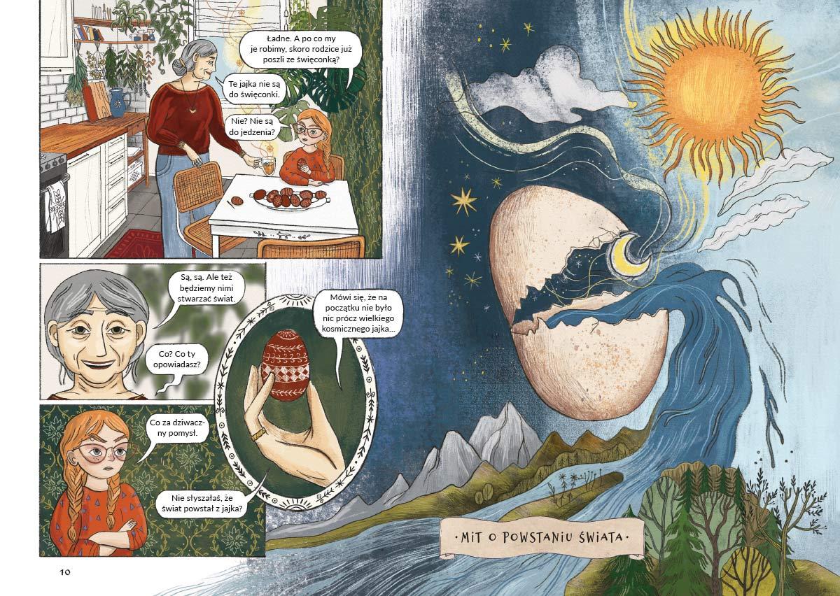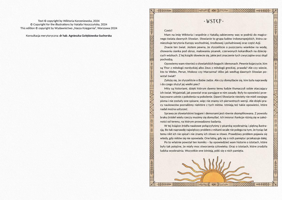 Mity słowiańskie w komiksie? Tego jeszcze nie było! W kogo wierzyli nasi słowiańscy przodkowie? O co chodzi z topieniem marzanny na wiosnę? Jak się pozbyć zmory? I co wspólnego z tym wszystkim ma... jajko?! Sprawa z mitologią Słowian jest trochę skomplikowana, ponieważ istnieje bardzo mało źródeł, ale pisarka Wiktoria Korzeniewska (obecna w Internecie jako @SlavicBook) i ilustratorka Natalia Noszczyńska podjęły się opowiedzenia wszystkiego młodszym czytelnikom w prosty i wciągający sposób. Poznacie słowiańskich bogów, stare tradycje, które przetrwały aż do dziś, oraz dostaniecie trochę inspiracji do słowiańskiego „zrób to sam”. Wiktoria Korzeniewska - z wykształcenia filolożka, literaturoznawczyni, z zawodu specjalistka ds. promocji książek, z serca twórczyni - pierwszego miejsca w polskim Internecie całkowicie poświęconego książkom z motywami słowiańskich wierzeń. Autorka Czerwonej baśni - historii o Babie Jadze i lesie, do którego lepiej nie wchodzić. Podejrzana o bycie miejską zmorą. Nigdy nie odmawia kawy i kromki chleba z masłem. Natalia Noszczyńska – ilustratorka, projektantka oraz architektka krajobrazu. Na co dzień pracuje z Sebastianem Łuczywo, tworząc zespół Black Dog Studio. Od dwóch lat tworzą razem autorski projekt ilustracji i małych wydawnictw pt. „Słowianie" nawiązujący do wierzeń, tradycji i folkloru naszych przodków. Jako ilustratorka Natalia rysuje i projektuje dla wydawnictw książkowych i muzycznych, dla instytucji kultury, do magazynów, czasopism i prywatnych autorów z Polski i zagranicy. Inspiracje czerpie z bliskiego kontaktu z naturą oraz otaczającym ją światem.