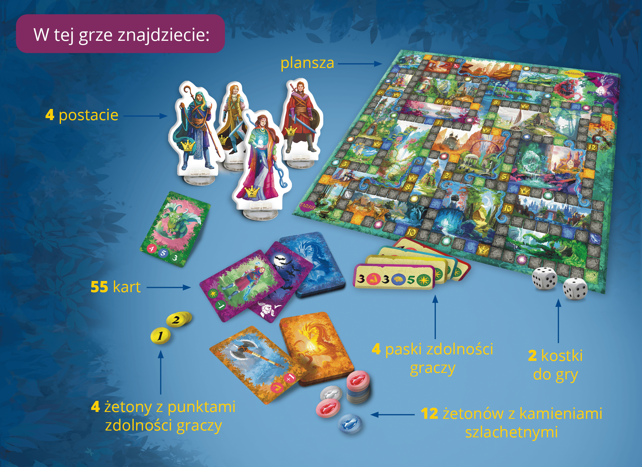 Czas wyruszyć. Smoczy kryształ czeka! Smoczy kryształ to rodzinna gra fantasy, w której mityczny smok Drakoniusz pilnie strzeże magicznego kryształu, zapewniającego dobrobyt i szczęście w krainie tego, kto go zdobędzie. Władcy czterech królestw wysyłają po kryształ swych najwaleczniejszych poddanych. Celem gry jest dotarcie do krainy smoka znajdującej się w prawym górnym rogu planszy. Wygrywa ten, kto pierwszy trafi do jaskini smoka oraz spełni wszystkie jego warunki. Smoczy kryształ to rodzinna gra fantasy, w której: wcielacie się w rolę dzielnych magów i wojowniczek pojedynkujecie się z potworami przemierzacie tajemnicze miasta, zaklęte uroczyska i zaczarowane rzeki zbieracie magiczne artefakty, by zdobyć cenny skarb Zawartość gry: plansza, 30 kart potworów (na odwrocie zielony smok), 12 kart artefaktu (pomarańczowy smok), 13 kart przygody (smok niebieski), 4 paski zdolności graczy, 12 żetonów z kamieniami szlachetnymi, 4 żetony z punktami zdolności, 4 postacie na podstawkach, dwie kostki do gry Liczba graczy: 2–4 Czas gry: 30–60 min