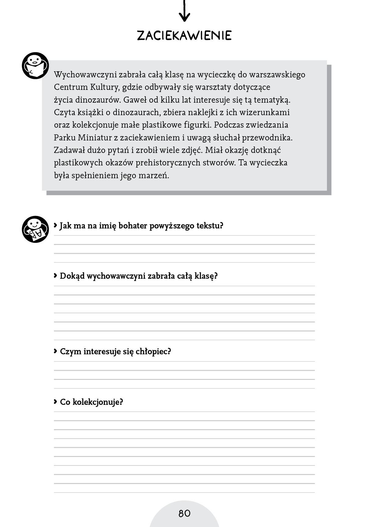 Książka zawiera zestaw ćwiczeń wspomagających uczniów klas I–III z zaburzeniami ze spektrum autyzmu w doskonaleniu kompetencji społeczno-emocjonalnych i poznawczych ze szczególnym uwzględnieniem następujących obszarów: trening umiejętności społecznych, teoria umysłu, centralna koherencja oraz emocje. Może zostać wykorzystana również w przypadku pracy z dziećmi z niepełnosprawnością intelektualną w stopniu lekkim, afazją, zespołem nadpobudliwości psychoruchowej (ADHD) czy niedostosowanych społecznie. Obok zadań stymulujących rozwój dziecka nauczyciel znajdzie w niej propozycje tematów zajęć rewalidacyjnych oraz cenne wskazówki przydatne w codziennej praktyce dydaktycznej.