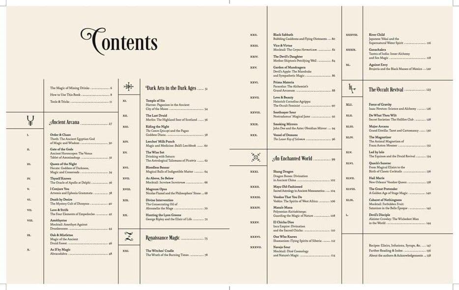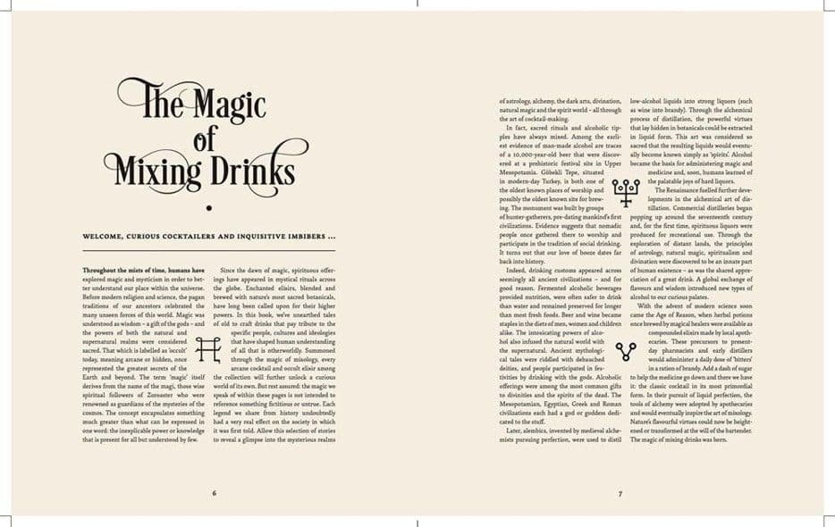 Each recipe is presented in a double-page spread that includes an engaging history, clear instructions, and original photography. Curious about druids? Try the Oak and Mistletoe, reminiscent of ancient European forests. Into voodoo? Enjoy a citrusy rum cocktail that’s finished with Peychaud’s bitters from an infamous New Orleans apothecary.