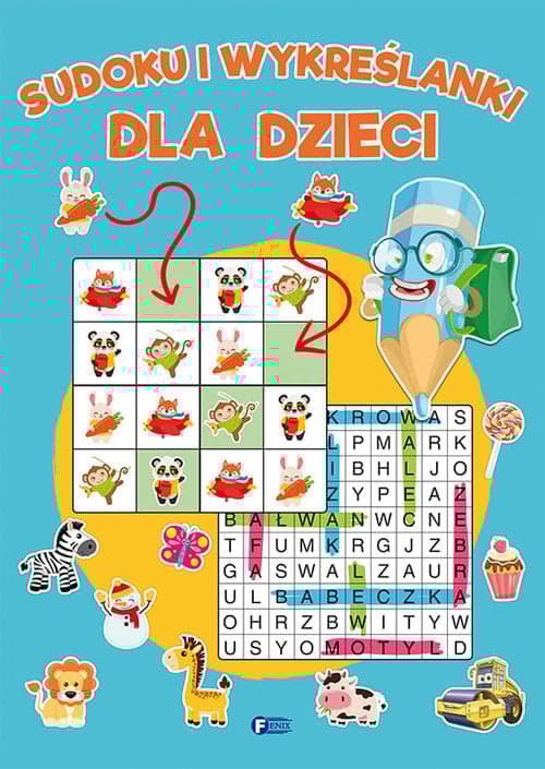 Istnieje wiele wariantów łamigłówki o nazwie sudoku. Tradycyjne uzupełnia się cyframi tak, aby żadne elementy nie powtarzały się w kwadratach, w pionie ani poziomie. W niniejszej publikacji proponujemy Wam pełne kolorów obrazkowe sudoku, które można rozwiązać, wstawiając w puste pola numerację przyporządkowaną do odpowiedniej ilustracji. Jeśli nigdy wcześniej tego nie robiliście, szybko przekonacie się, jaka wspaniała to zabawa. Ponadto w książce znajdziecie też wykreślanki, w których należy odnaleźć poukrywane słowa. Wystarczy, że trochę wytężycie wzrok, a na pewno uda Wam się je dostrzec!