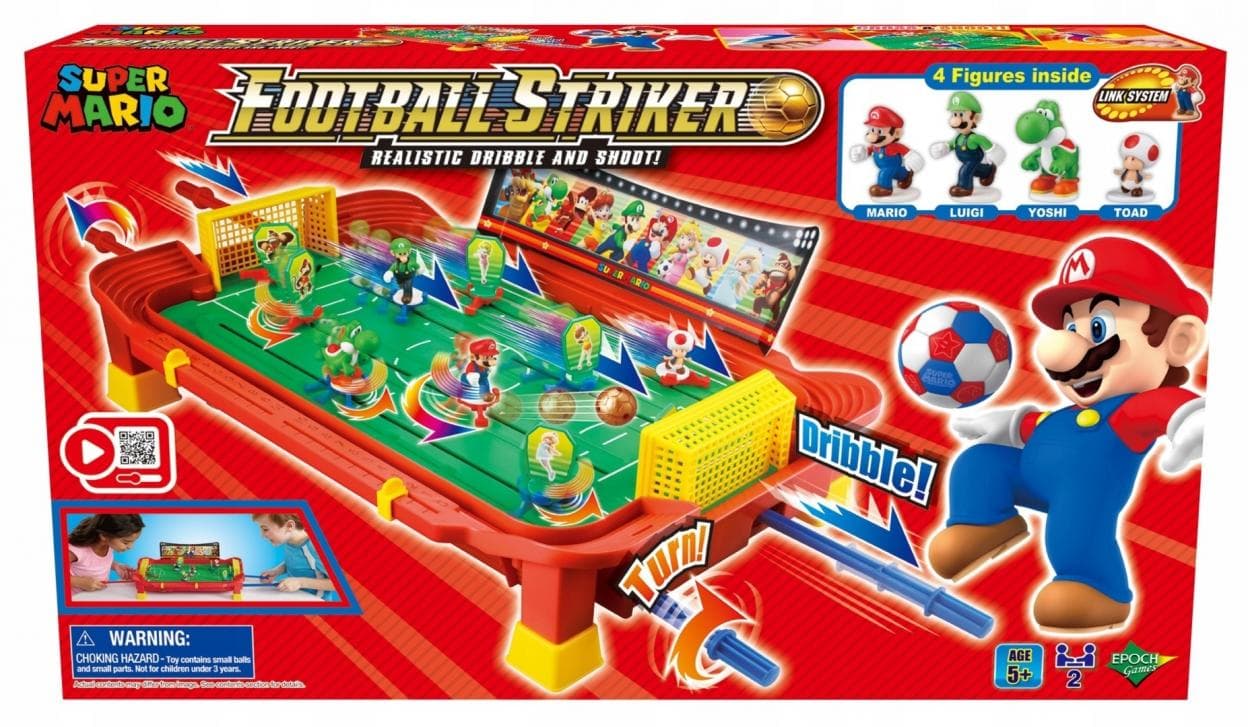 Zapraszamy na fascynujący mecz piłki nożnej! Mario, Luigi, Toad i Yoshi już czekają na boisku. Teraz Ty zostajesz jednocześnie trenerem i zawodnikiem. Prowadź swoją drużynę za pomocą drążków. Celne podania to klucz do zwycięstwa. Gooool! Super Mario Football Striker od EPOCH to dynamiczna i pełna akcji gra w piłkarzyki, w której liczy się refleks, spryt i świetna zabawa. Idealna na wspólne rozgrywki z przyjaciółmi i rodziną. W zestawie znajdziesz cztery figurki bohaterów: Mario, Luigi, Toad i Yoshi. Dla 2 graczy od 5 roku życia.