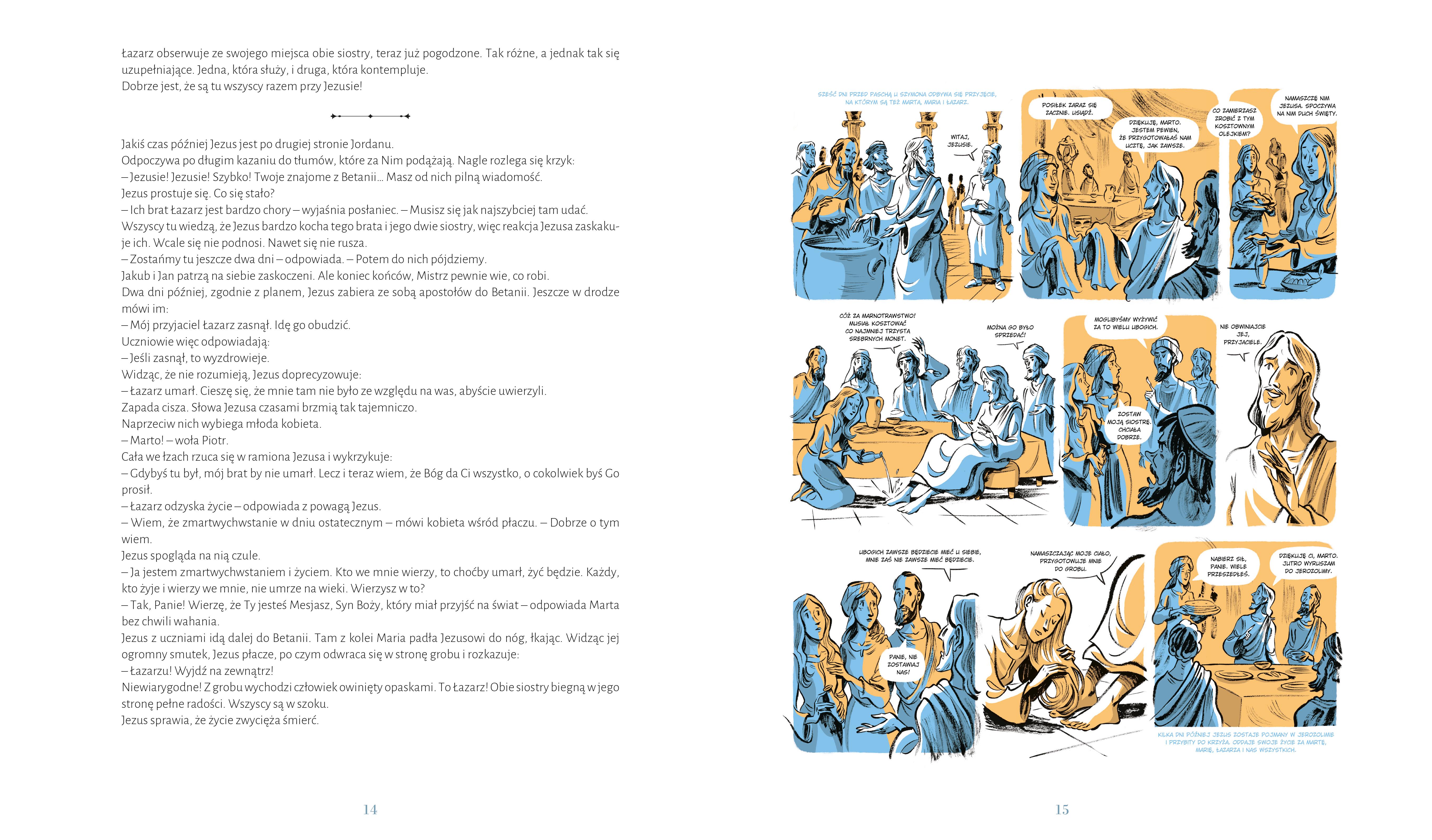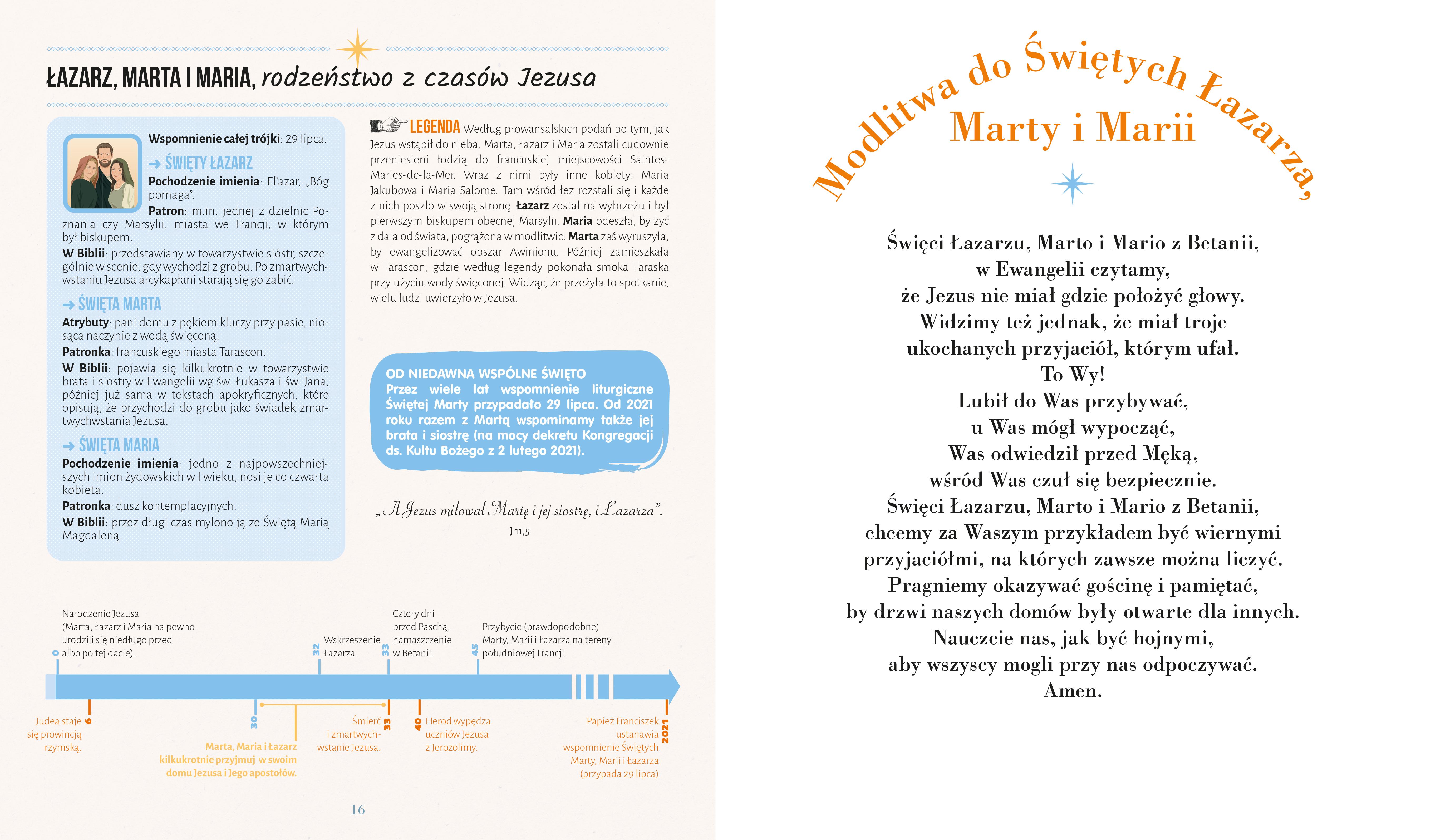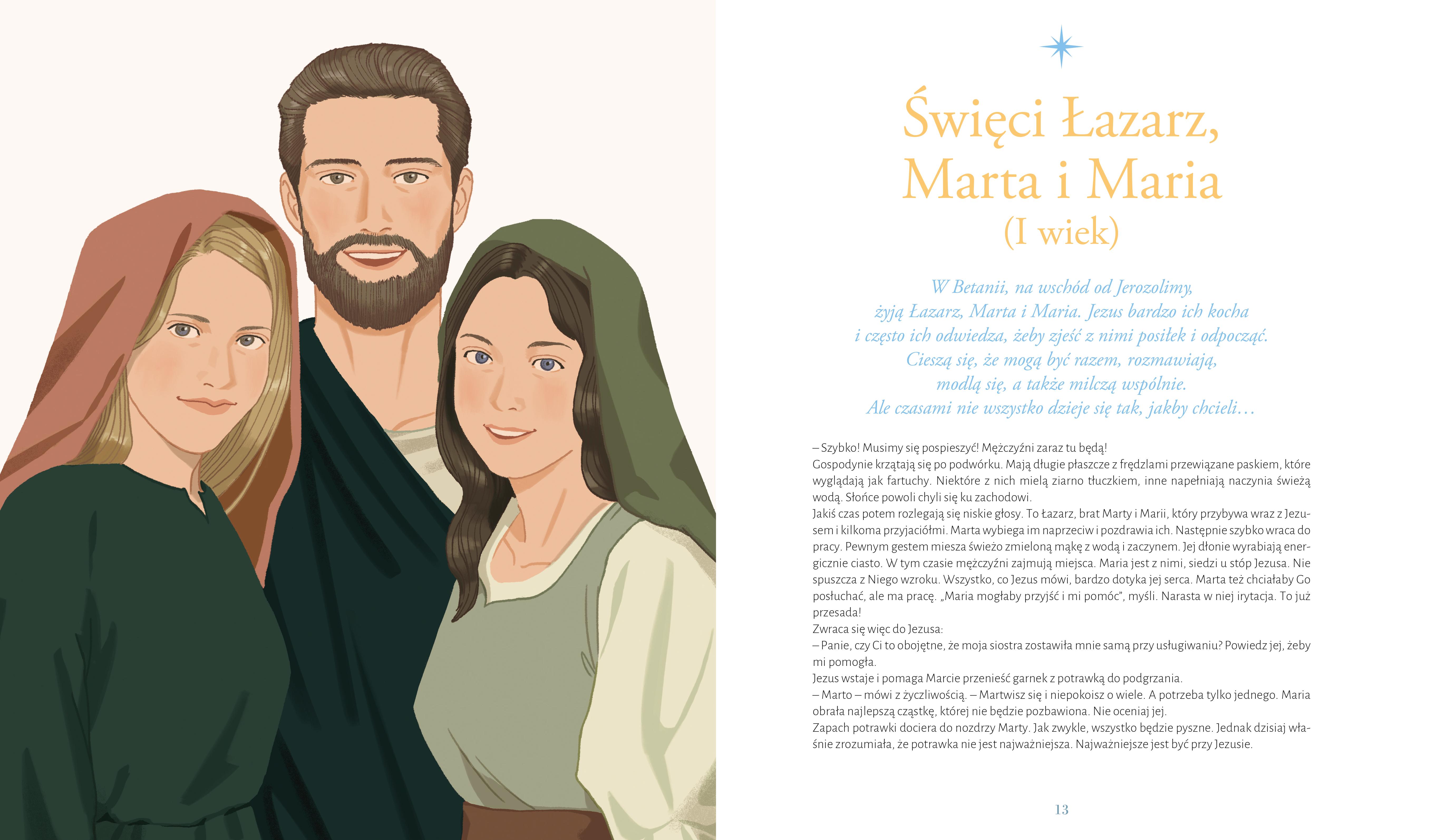 Pełne pasji biografie, przeplatane komiksami, faktami historycznymi i modlitwami, oraz piękne ilustracje z pewnością zachęcą młodych czytelników do lektury i dadzą im szansę poznać między innymi: Świętych Łazarza, Marię i Martę, Świętych Kosmę i Damiana, Świętych Cyryla i Metodego, siostry Martin czy Świętą Teresę Benedyktę od Krzyża i jej siostrę Różę.