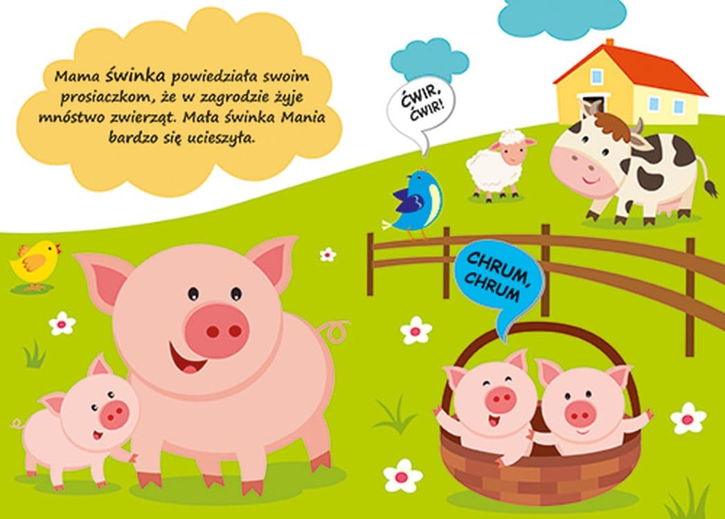 Książka zabiera małych czytelników w niezapomnianą PODRÓŻ NA WIEŚ. Dzieci znajdą w niej krótkie HISTORYJKI o tym, jak świnka spotyka wiejskie zwierzątka, oraz mnóstwo WYRAZÓW DŹWIĘKONAŚLADOWCZYCH. Wyróżnikiem publikacji jest 6 różnorodnych DŹWIĘKÓW wydawanych po naciśnięciu silikonowych PRZYCISKÓW DŹWIĘKOWYCH. Dzięki niej maluch dowie się, jakie dźwięki wydają świnia, krowa czy koń. Sympatyczne ILUSTRACJE charakteryzują się ŻYWĄ KOLORYSTYKĄ.