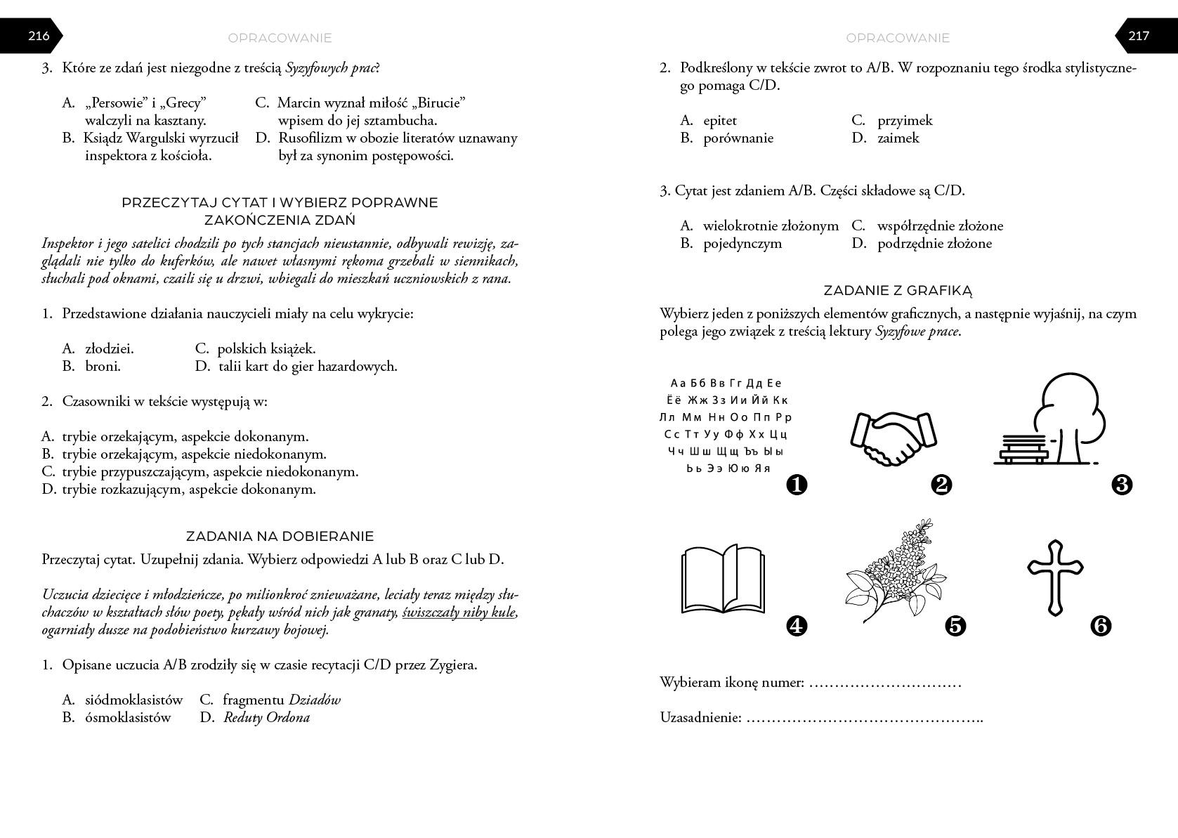 • streszczenia: krótkie (całego utworu) i szczegółowe (kolejnych rozdziałów lub części)