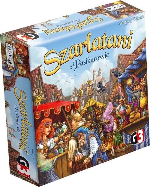 Szarlatani z Pasikurowic to lekka, aczkolwiek bardziej złożona gra planszowa o tworzeniu eliksirów dla 2 do 4 graczy od 10 lat. Gra jest kolorowym, prostym, ale niebanalnym tytułem, a wszystko to dzięki różnym urozmaiceniom. Gracze wcielający się w szarlatanów dobierają składniki ze swoich woreczków i dodają je do kociołka. Czynią tak dopóty, dopóki nie uznają, że eliksir jest gotowy. Muszą jednak uważać, bo jeśli dodadzą zbyt dużo specjalnego składnika, kociołek eksploduje! Kluczem jest więc odnalezienie właściwego momentu, w którym należy przerwać dobieranie składników. Dobrą strategią może być rozpoczynanie od mniej skomplikowanych eliksirów, aby zdobyć punkty i monety za które można kupić nowe składniki. Kupno najbardziej wartościowych składników, odrobina szczęścia i kolejny eliksir może być najlepszym spośród tych, jakie uwarzyli wszyscy znachorzy w całym kraju. Zasady gry Szarlatani z Pasikurowic: Na początku rozgrywki, każdy z uczestników zabawy otrzymuje planszetkę, przedstawiającą kociołek oraz woreczek z początkowymi składnikami. Gra trwa dziewięć rund, podczas których, wszyscy gracze w tym samym czasie, losują składniki i dokładają je do swoich kociołków. Gracze sami decydują kiedy chcą przerwać losowanie składników, muszą jednak uważać - jeśli wartość białych znaczników na planszy przekroczy siedem, kociołek wybucha! Po tym jak wszyscy gracze skończą losować składniki, następuje rozpatrywanie zawartości kociołków. Ważnym etapem jest kupowanie nowych składników do woreczków, co pozwala to na tworzenie coraz lepszych mikstur! Grę urozmaicają karty zmieniające zasady rozgrywki. Zwycięży gracz, który zdobędzie najwięcej punktów. Podstawowe informacje Liczba graczy: 2 - 4 osoby Wiek: od 10 lat Czas gry: ok. 45 minut Zawartość pudełka: 4 plansze graczy - kociołki plansza główna 4 butelki 4 woreczki 8 znaczników kropelek 4 znaczniki szczurów 4 znaczniki punktów 20 rubinów 12 ksiąg ze składnikami 219 znaczników składników 4 pieczęcie punktów zwycięstwa kość bonusowa znacznik rund almanach składników instrukcja