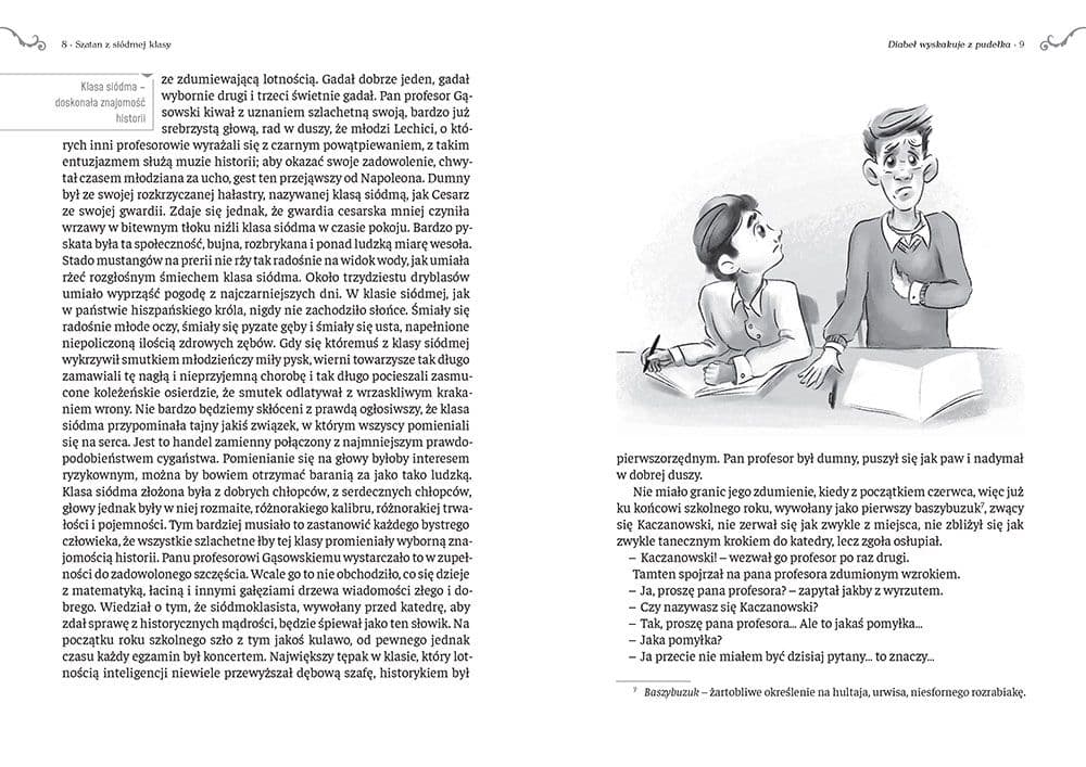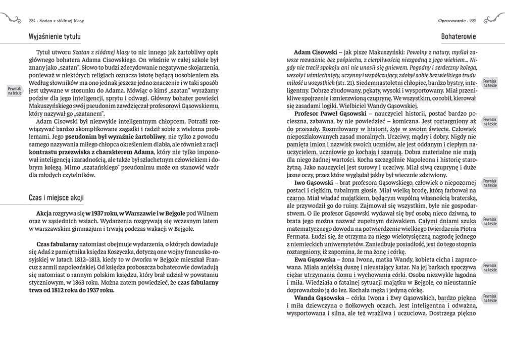 Ukryty skarb, złoczyńcy, zagadki i... miłość W tej książce znajdziemy wszystko, czego potrzebuje powieść, od której nie można się oderwać. Mamy więc młodego detektywa - szatańsko sprytnego i inteligentnego Adasia, zagadkę, sięgającą czasów wojen napoleońskich, szajkę opryszków, a do tego liczne zwroty akcji, tajemnicze szyfry, prawdziwy skarb, a do tego fiołkowe oczy pewnej bardzo ładnej dziewczyny. To przepis na idealną książkę dla dzieci i młodzieży. Nic dziwnego zatem, że książka cieszy się niesłabnącą popularnością od lat! Mnóstwo niezbędnych przypisów Szatan z siódmej klasy został wydany w 1937 roku, w tym roku też rozgrywa się akcja powieści. Do tekstu dodaliśmy wiele przypisów, które pozwolą zrozumieć realia owych czasów, przybliża też znaczenie wielu sentencjom, powiedzonkom, uczeń będzie mógł dowiedzieć się wiele o przywoływanych postaciach i wydarzeniach - to prawdziwa skarbnica wiedzy! Szczegółowe opracowanie Opracowanie, które znajduje się na końcu książki, zawiera wszystkie niezbędne informacje, które będą potrzebne uczniom podczas pracy z lekturą. Biografia Kornela Makuszyńskiego, geneza powieści, spis bohaterów, plan wydarzeń, streszczenie - a nade wszystko pewniaki na test - wyróżnione zostały wiadomości, o które najczęściej pytają nauczyciele. Lektura dla przyjemności Szatan z siódmej klasy jest polecany jako lektura w szkole podstawowej. I jest niezwykle często proponowana uczniom, ponieważ to jedna z tych lektur, które czyta się z zapartym tchem i prawdziwą przyjemnością. Polecamy!