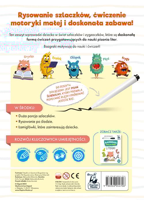 Różnorodne szlaczki i zygzaczki to doskonała zabawa, której towarzyszą Bazgraki – te niesamowite stworki wspierają malucha w nauce.