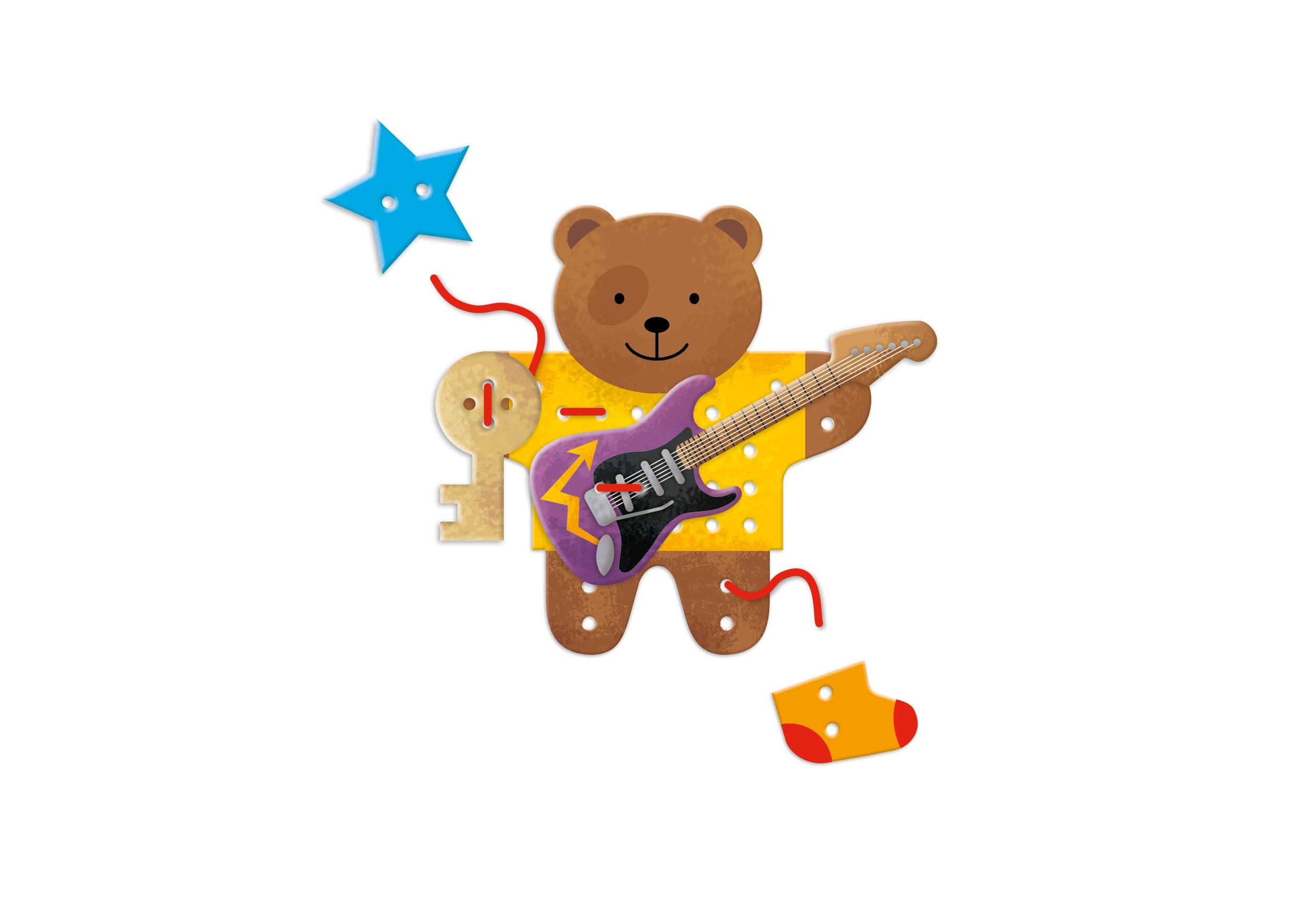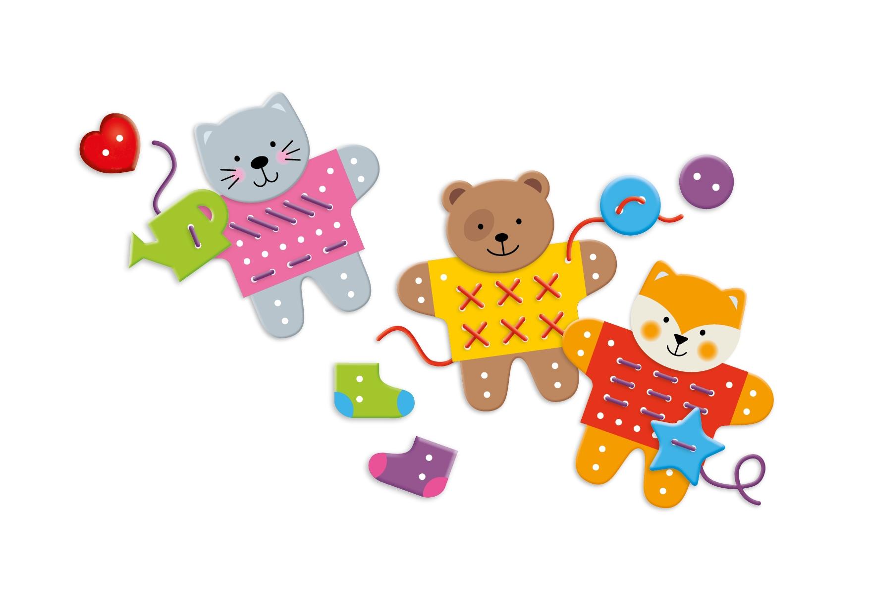 Czas stworzyć śliczny wzór na sweterku. Sznureczki w dłoń. Pora uwolnić Waszą kreatywność. Czy to będzie gwiazda, a może kwiatek? Możliwości są niemal nieograniczone! Zabawa ćwiczy motorykę małą i kreatywność.