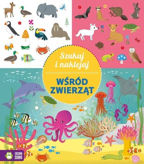 Która ryba różni się od pozostałych? Czy widzisz małpkę inną niż pozostałe? Odszukaj słonia bez kłów. Otwórz tę książkę z kolorowymi naklejkami i odkryj fascynujący świat zwierząt! Czekają na Ciebie ośmiornice, żyrafy, foki i jelonki! Przyjrzyj się uważnie obrazkom. Odpowiedz na pytania i przyklej naklejki we właściwych miejscach. Dobrej zabawy! „Szukaj i naklejaj” to seria książek dla dzieci z naklejkami. Na każdej stronie znajdziesz ciekawe ilustracje, zestawy naklejek oraz zadania do wykonania. Przyklejaj naklejki, szukaj różnic i rozwiązuj zagadki! Z tymi książkami będziesz się nie tylko dobrze się bawić, ale również rozwijać spostrzegawczość. Zabawa z naklejkami to też dobry sposób na ćwiczenie motoryki ręki.
