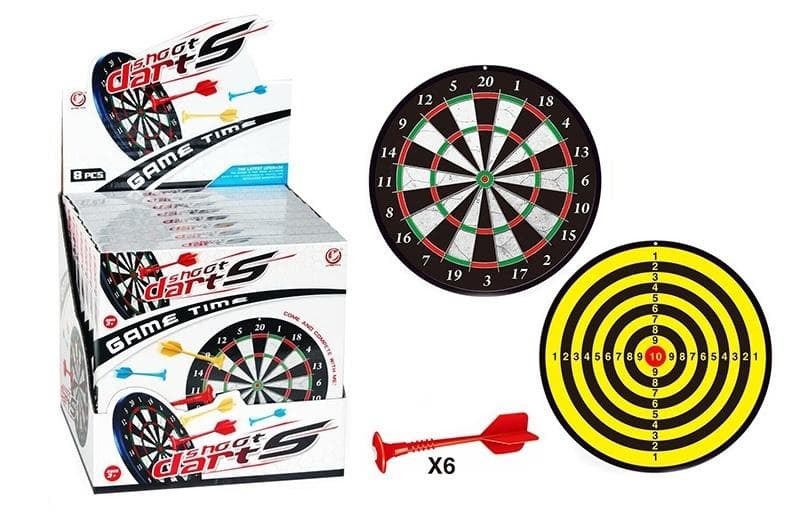 W zestawie: dwustronna tarcza, hak do zawieszenia, 6 rzutek w 3 kolorach, Pozostałe informacje: display 8 szt., śr. tarczy 31 cm, wym. opak. 31,5 x 31,5 x 3 cm, wym. display 32,5 x 26,5 x 32 cm, 3+