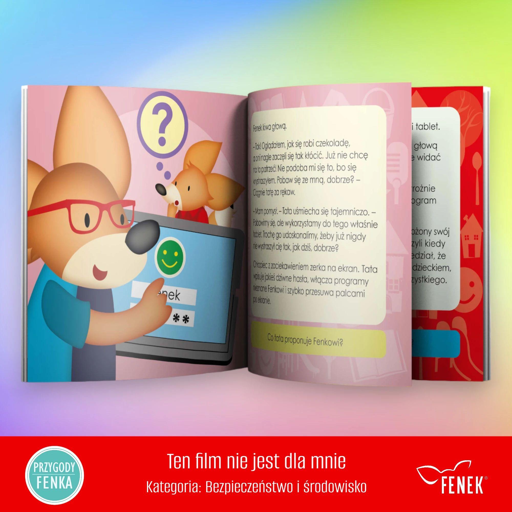 uświadomi sobie, że nie powinno się spędzać w sieci zbyt wiele czasu pozna pewne możliwości dostosowywania urządzeń elektronicznych do swojego wieku Fenek, ciekawski mały bohater, tym razem odkrywa, że świat internetowych filmików może być zaskakujący i nie zawsze przyjazny. Gdy rodzice są zajęci, Fenek ogląda na tablecie filmiki, które prowadzą go przez różnorodne emocje, od zaciekawienia po niepokój. Wędrówka przez cyfrowy świat staje się dla niego lekcją o tym, że nie wszystkie treści są odpowiednie dla dzieci. Na szczęście, z pomocą taty, Fenek uczy się, jak korzystać z tabletu w sposób bezpieczny, co jest głównym przesłaniem tej historii.