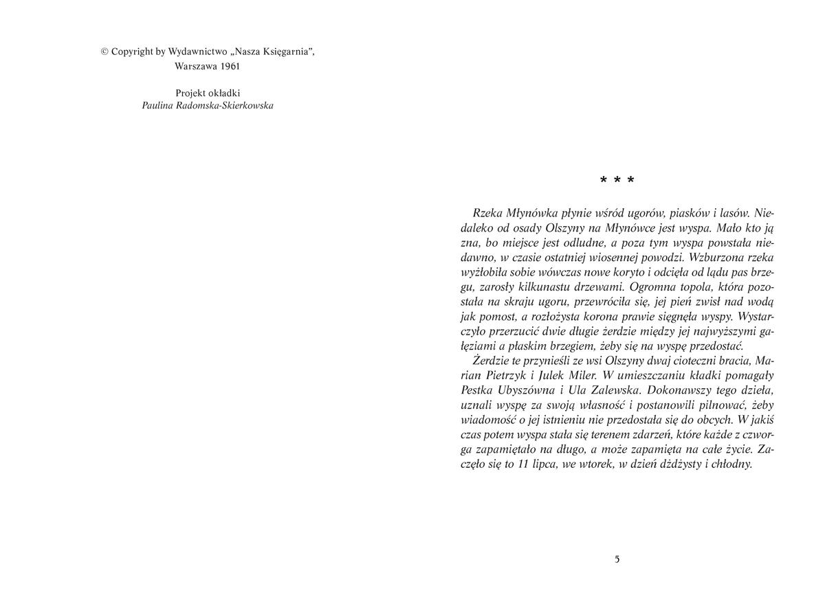 Od pierwszej strony tej znakomitej powieści czytelnik jest zaangażowany w sprawy, którymi żyją bohaterowie. Ulka, Pestka, Marian i Julek są zaskoczeni pojawieniem się na „ich” wyspie obcego chłopaka, potrzebującego pomocy. Ukrywają go przed dorosłymi, ale nie wiedzą, że Zenek ma za sobą bolesne przeżycia i nie jest tym, za kogo się podaje. Wkrótce sytuacja tak bardzo się skomplikuje, że trzeba będzie ujawnić prawdę.