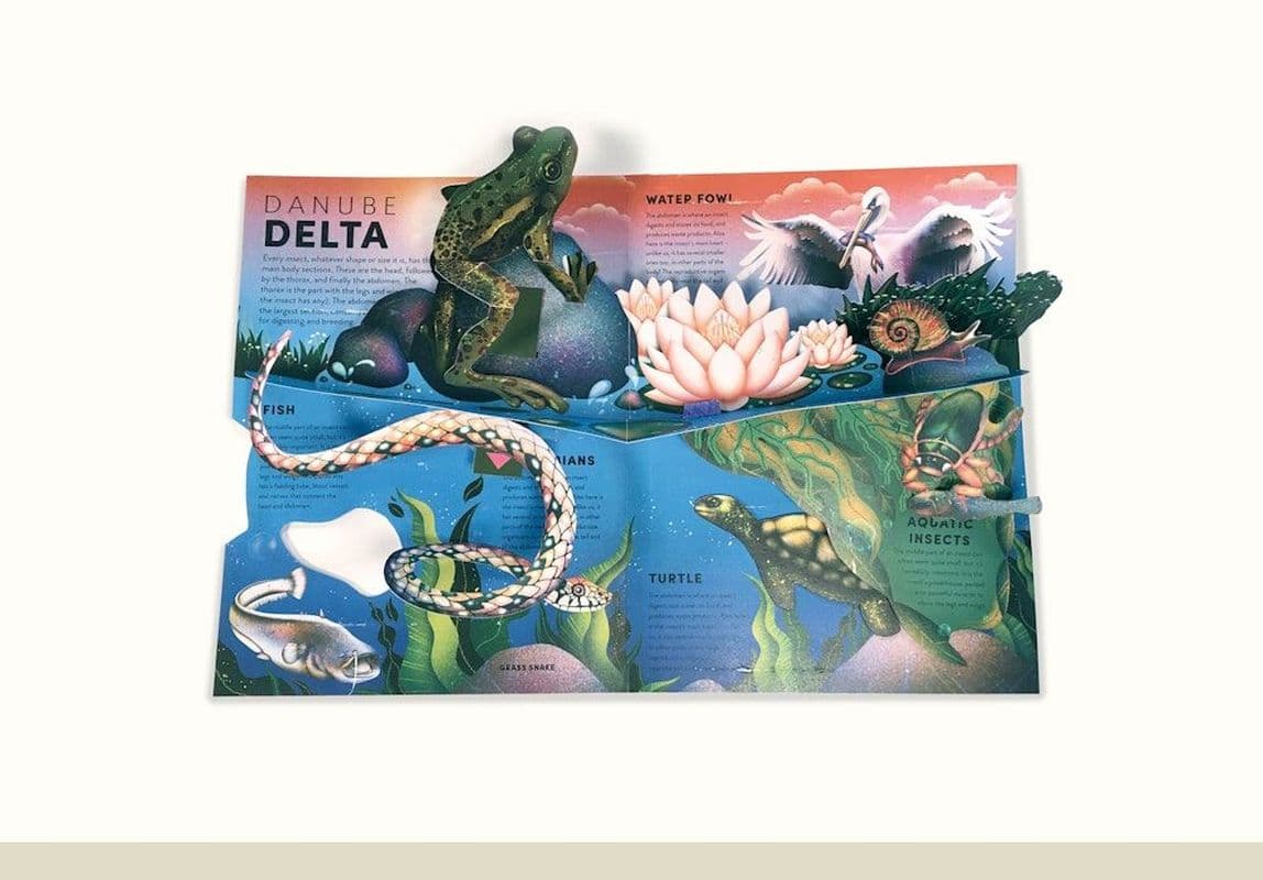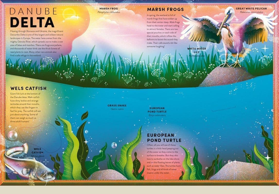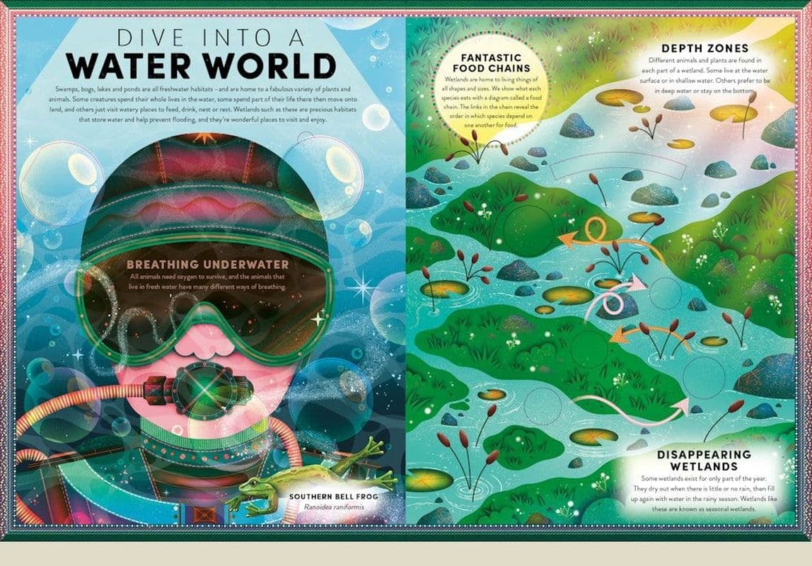Wetlands are among the richest habitats on our planet and a crucial home to some of the world's most endangered species. Bursting with frogs and other amphibians, as well as a whole host of other wildlife, they are dazzling havens of activity waiting to be explored. Packed with multi-layered pop-ups and flaps to lift, this incredible feat of paper-engineering allows young readers to look inside three wetland habitats, revealing wonder after wonder, page after page. From the surface of the water, where bugs skate, spiders hunt and flowers spread their petals, to the murky depths, where myriad creatures fight for survival, this book will take you on a tour of the wetlands like no other. Written by award-winning wildlife journalist and nature nerd Ben Hoare and illustrated in in striking colour and texture by rising star Jasmine Floyd, this fact-packed pop-up shows the true beauty of frogs, amphibians and the wildlife they live alongside. Perfect for readers from 7 to 100.Szczegółowe informacje na temat książki The Incredible Pop-up Frog