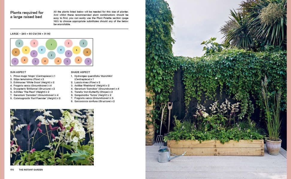 An easy-to-understand walkthrough of the principles behind ‘Instant’ beds and pots.A practical section explaining the inspiration and design principles for each style and the colour palette and materials, accompanied by two projects – a raised flower bed and a pot trio.An ‘essentials’ section of simple how-to’s (sowing seeds, making compost, etc) and the tools/products you’ll need.
