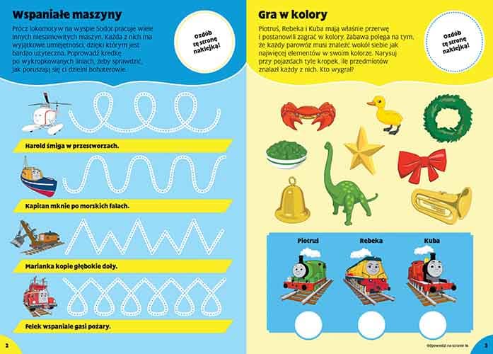 16 stron łamigłówek o zróżnicowanym stopniu trudności i ponad 100 naklejek. Część z nich można wykorzystać do rozwiązywania zadań, a część – do zabawy. Łamigłówki w książeczce zostały dobrane tak, aby uwzględnić indywidualne różnice w rozwoju dzieci i pomóc w kształtowaniu umiejętności niezbędnych na pierwszym etapie edukacji. Trudniejsze zadania mają specjalne oznaczenia – w ich rozwiązywaniu mogą pomóc rodzice!
