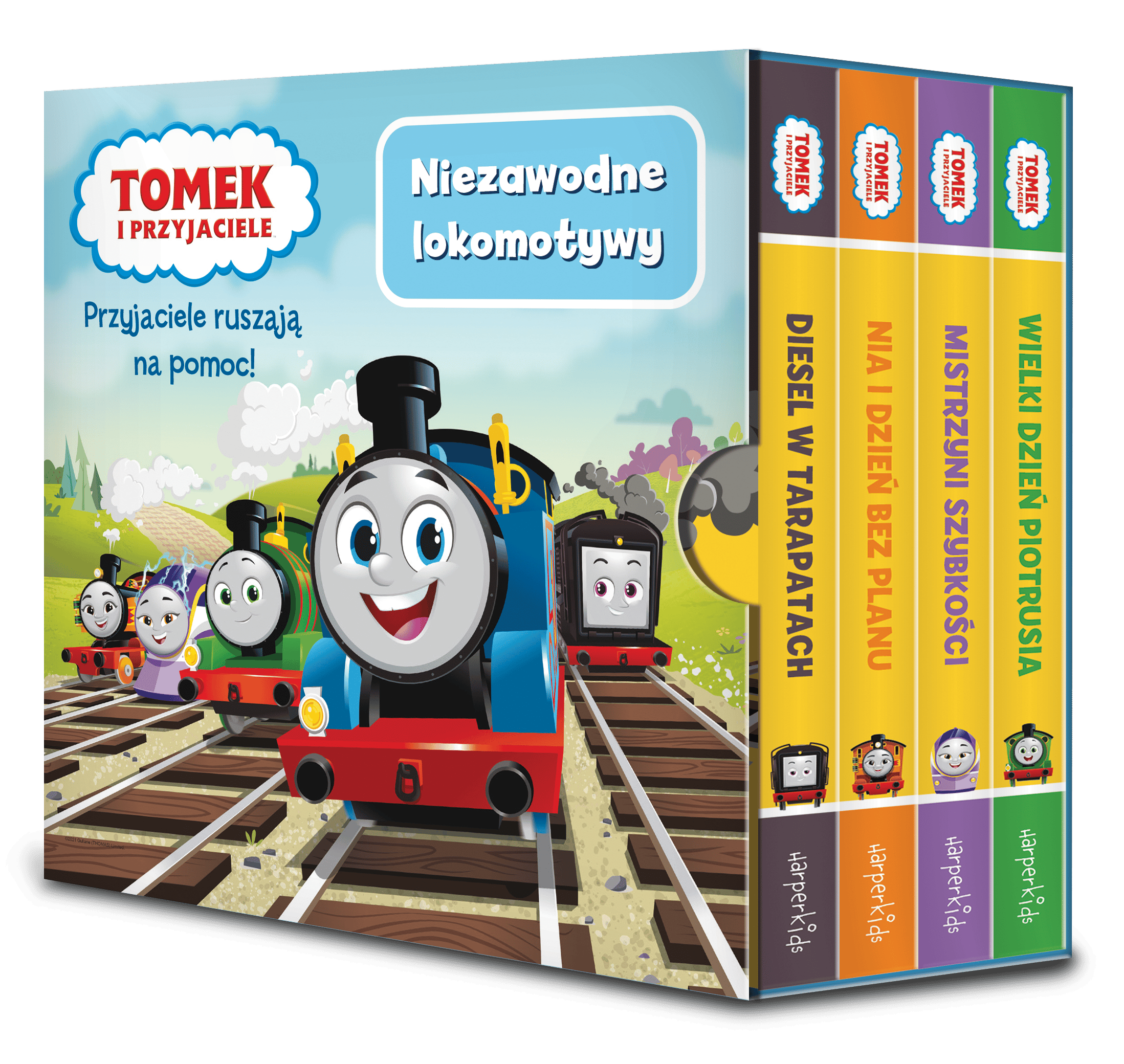 Moja pierwsza biblioteczka to kolekcja 4 uroczych książeczek w pięknym etui – idealny prezent dla najmłodszych czytelników. Na wyspie Sodor nie zawsze wszystko idzie zgodnie z planem. Wiedzą o tym lokomotywy, które każdego dnia spotykają niezwykłe przygody a także kłopoty. Na szczęście przyjaciele są zawsze gotowi do pomocy w tarapatach i do wspólnej zabawy. Każda książeczka z kolekcji prostym językiem opowiada przygody Tomka i jednej lokomotywy z wesołej ekipy jego przyjaciół. Książeczki mają format wygodny dla małych rąk i bezpieczne zaokrąglone rogi. Kolorowe ilustracje sprawią, że mały czytelnik będzie chciał wracać do czytania i oglądania obrazków w nieskończoność. Kolekcja czterech książek Moja pierwsza biblioteczka jest opakowana w wygodne etui, co sprawia że można ją zabrać ze sobą na spacer do parku czy w podróż. Kartonowe strony są odporne na zabrudzenia i odporne na działanie małych rąk. Wielki dzień Piotrusia Mistrzyni szybkości Nia i dzień bez planu Diesel w tarapatachSzczegółowe informacje na temat książki Tomek i przyjaciele Niezawodne lokomotywy